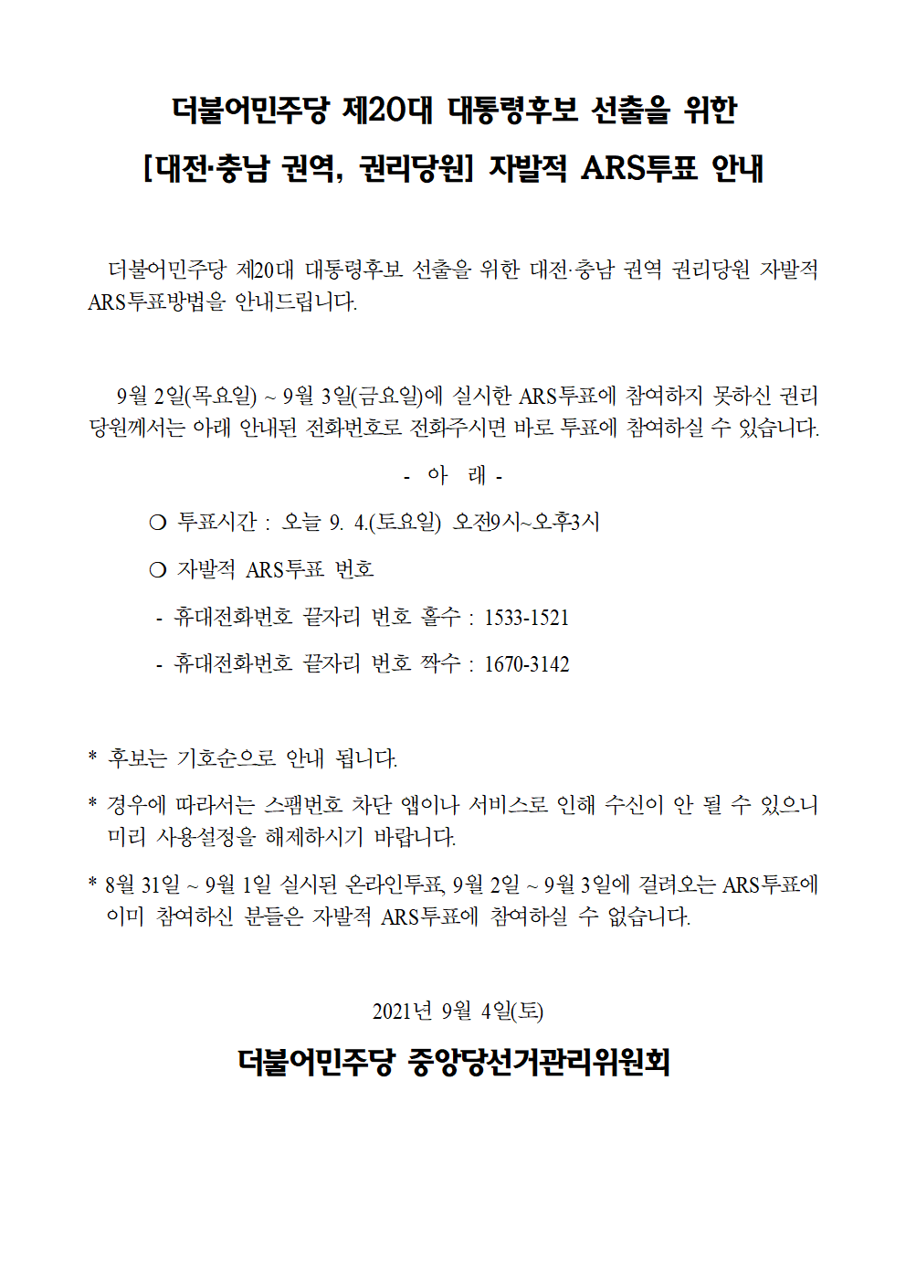 더불어민주당 제20대 대통령후보 선출을 위한 [대전·충남 권역, 권리당원] 자발적 ARS투표 안내