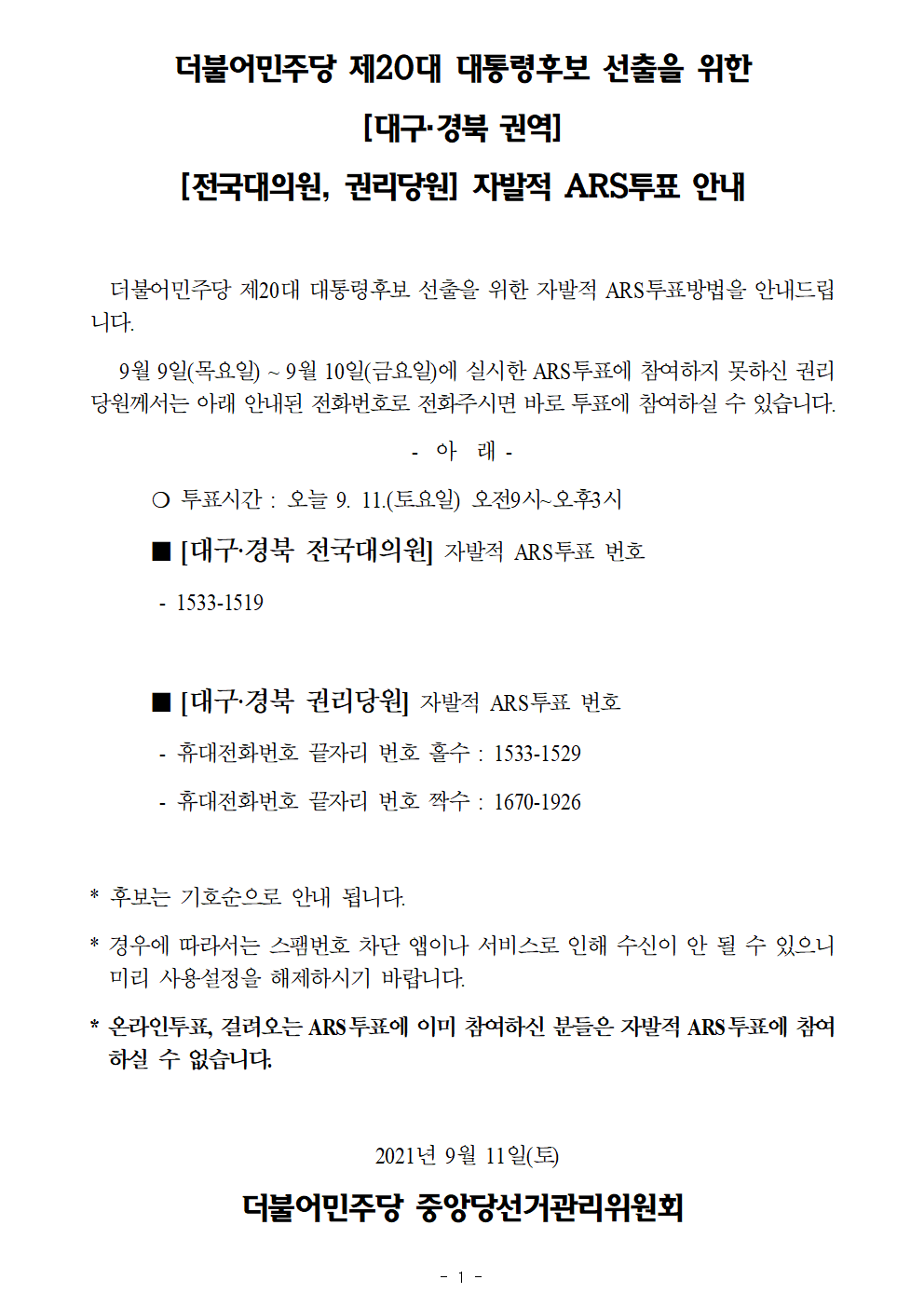 더불어민주당 제20대 대통령후보 선출을 위한 [대구·경북 권역] 자발적 ARS투표 안내