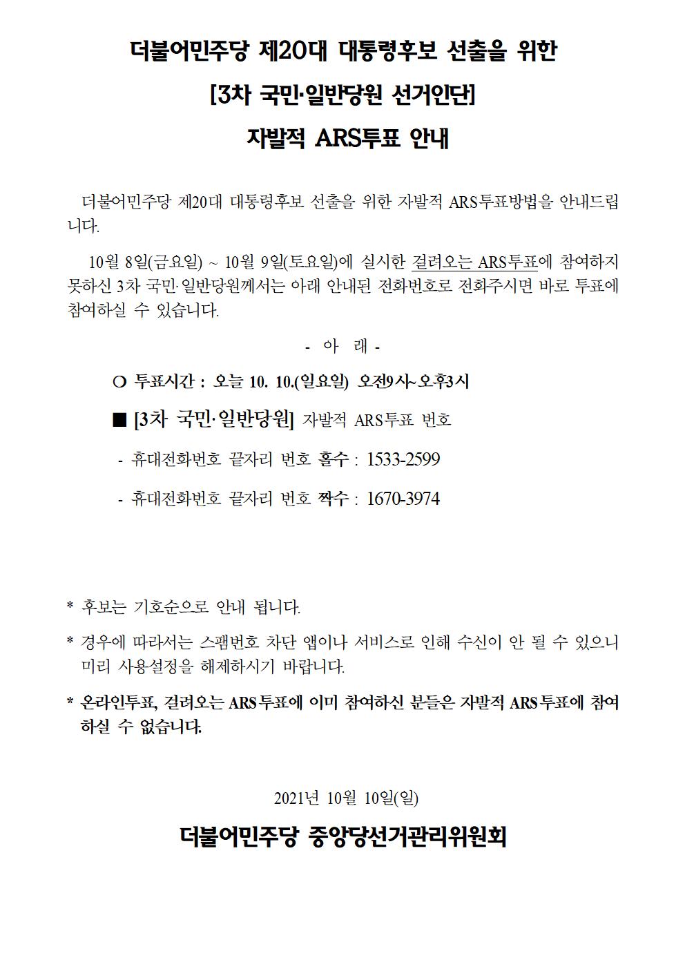 더불어민주당 제20대 대통령후보 선출을 위한 [3차 국민·일반당원] 자발적 ARS투표 안내