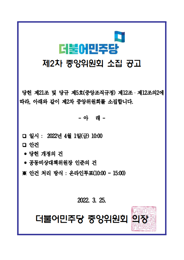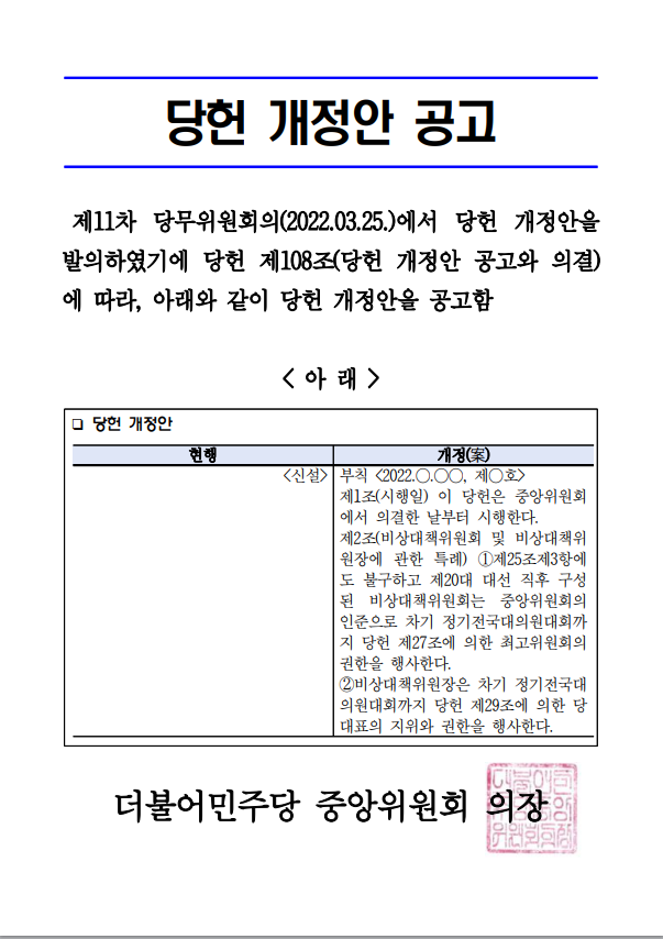 제2차 중앙위원회 소집 및 당헌 개정안 공고