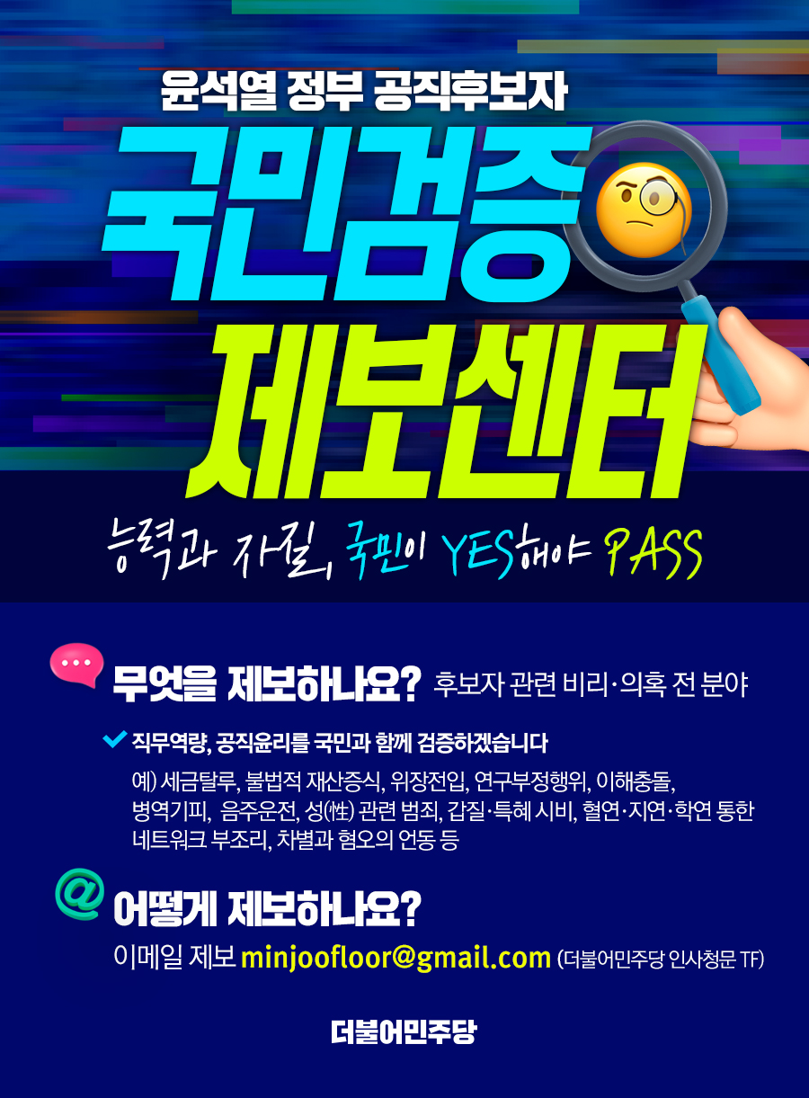 더불어민주당 인사청문TF는 윤석열 정부 공직후보자에 대해 국민의 눈높이에서, 국민과 함께 인사검증을 위하여 ‘국민검증 제보센터’를 개설하였습니다.