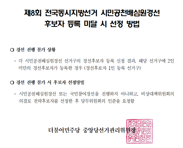 제8회 전국동시지방선거 시민공천배심원경선 후보자 등록 미달 시 선정 방법