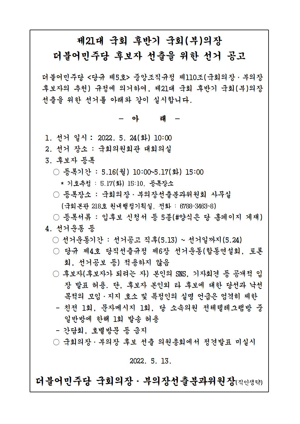 제21대 국회 후반기 국회(부)의장 더불어민주당 후보자 선출을 위한 선거 공고