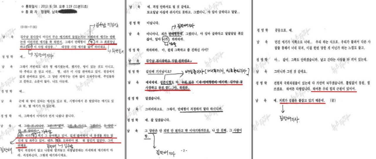 탐사보도전문채널 뉴스타파가 공개한 2012년 8월 18일 자 정영학 녹취록에는 남욱과 정영학이 김수남 전 검찰총장에 대해 언급하는 대목이 나옵니다. 남욱이 “김수남 검사장하고 정말 친하대요”라고 말하자 정영학은 “김만배 기자님이요?”라고 되묻습니다. 이에 남욱은 “수원 일은 이제 만배형한테 애기해. 김수남 검사장하고 완전 깜(.,)이야”라고 말합니다.
