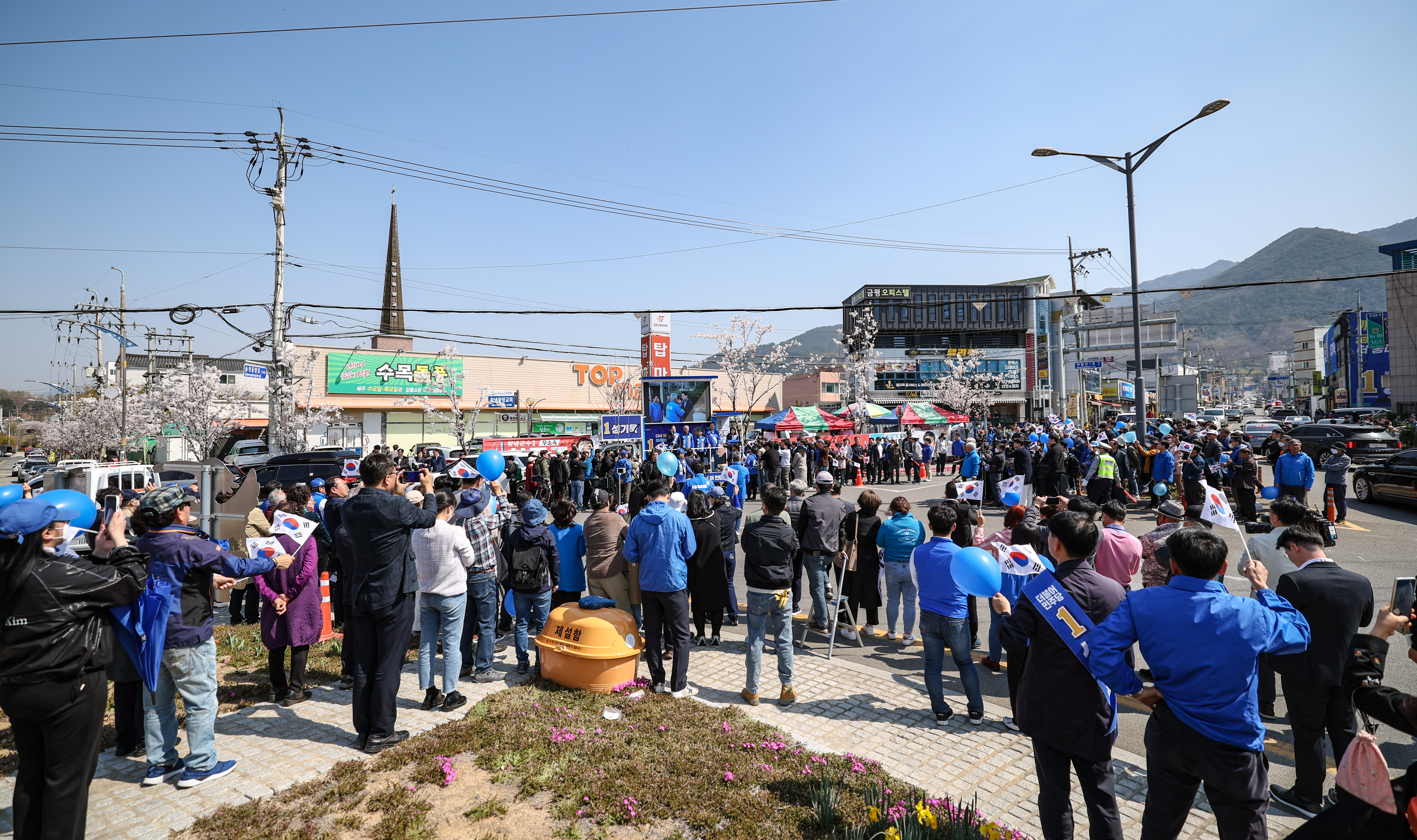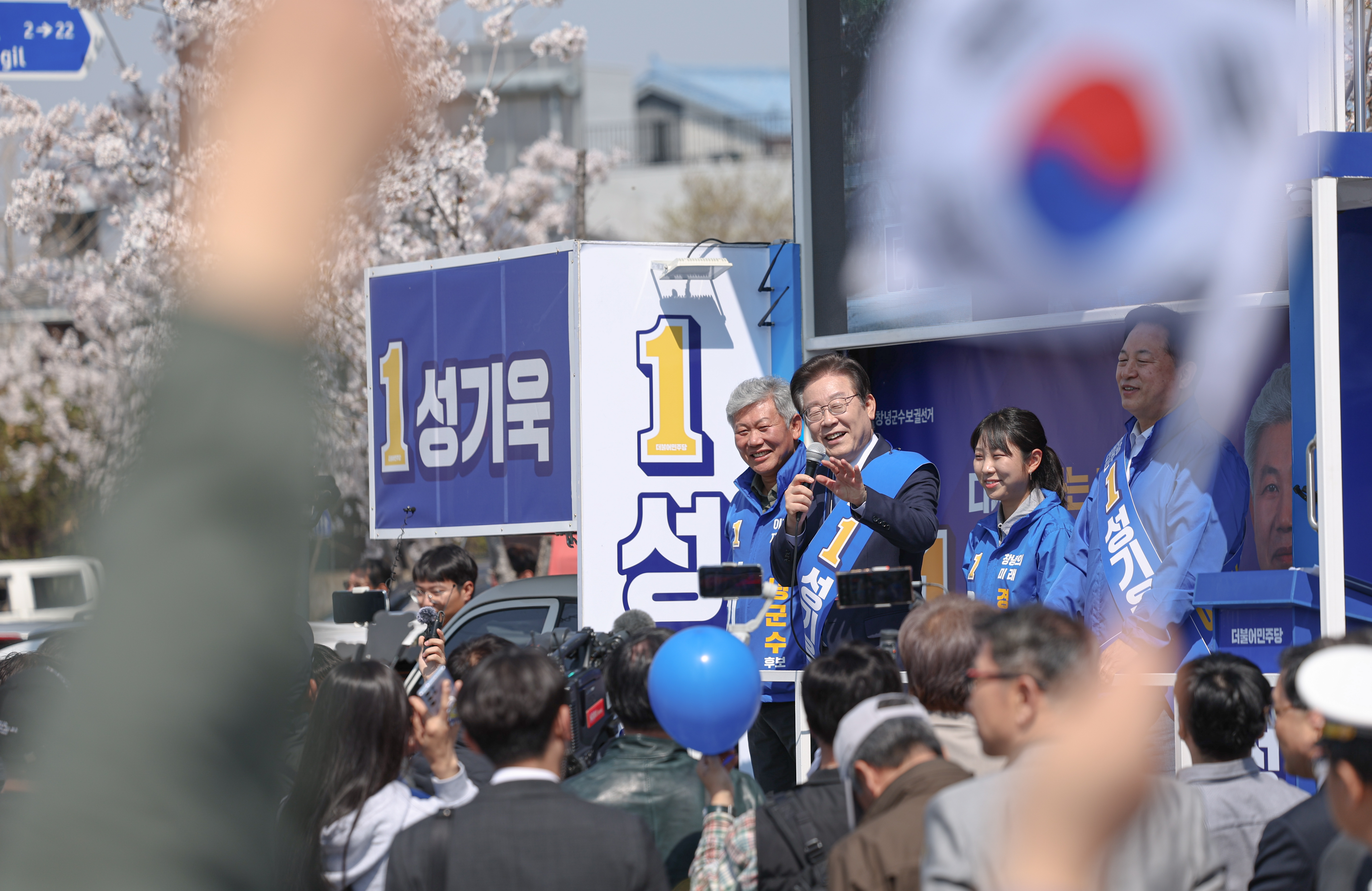 이재명 당대표가 2023.03.28.(화) 경남 창녕에 위치한 창녕장에서 성기욱·우서영 후보자 합동 지원유세 및 창녕장 상가방문 인사를 하고 있다.