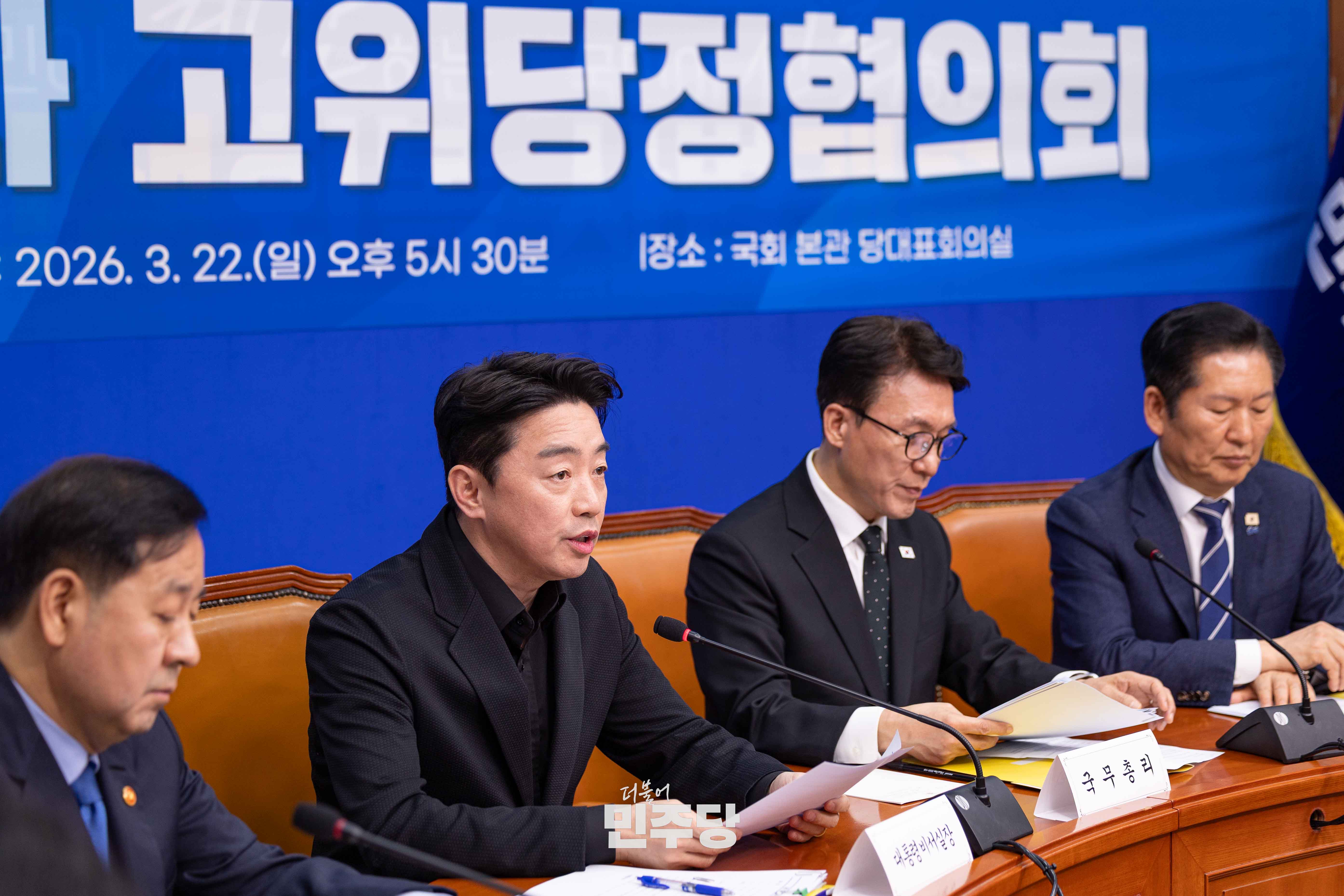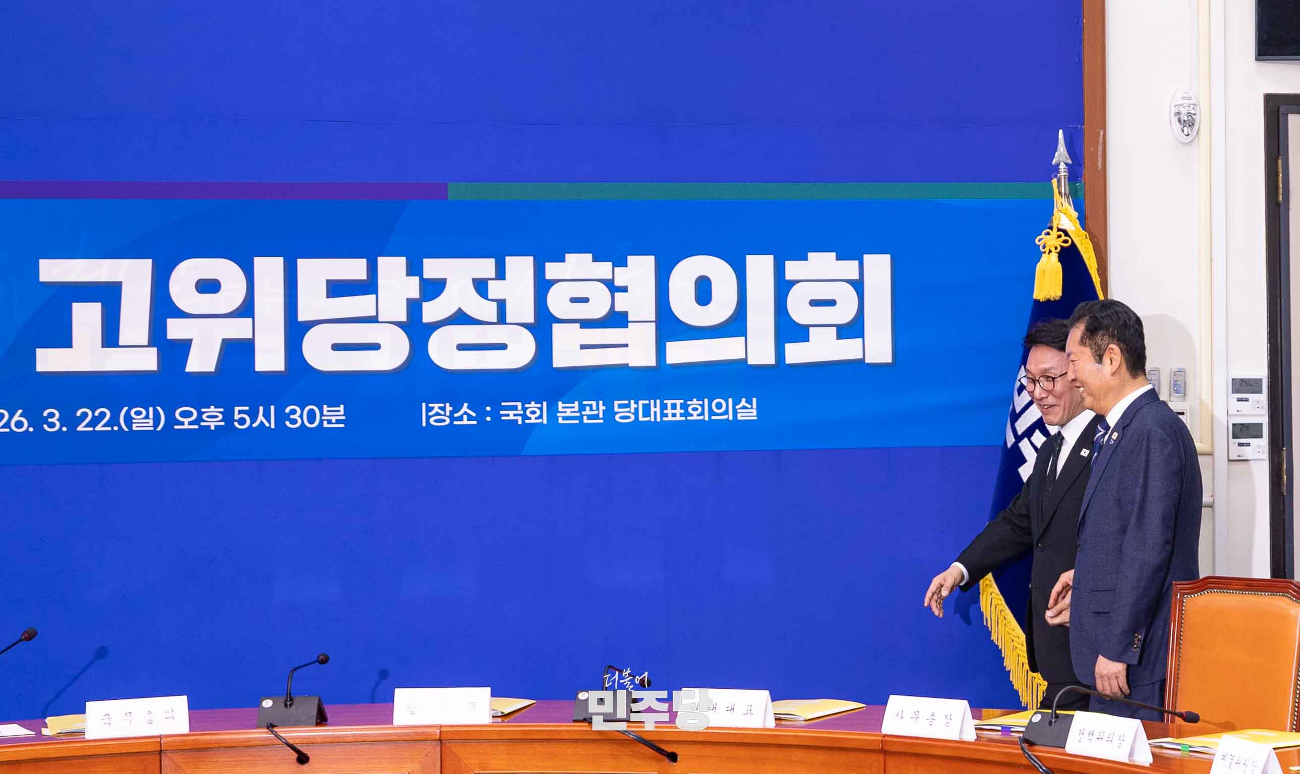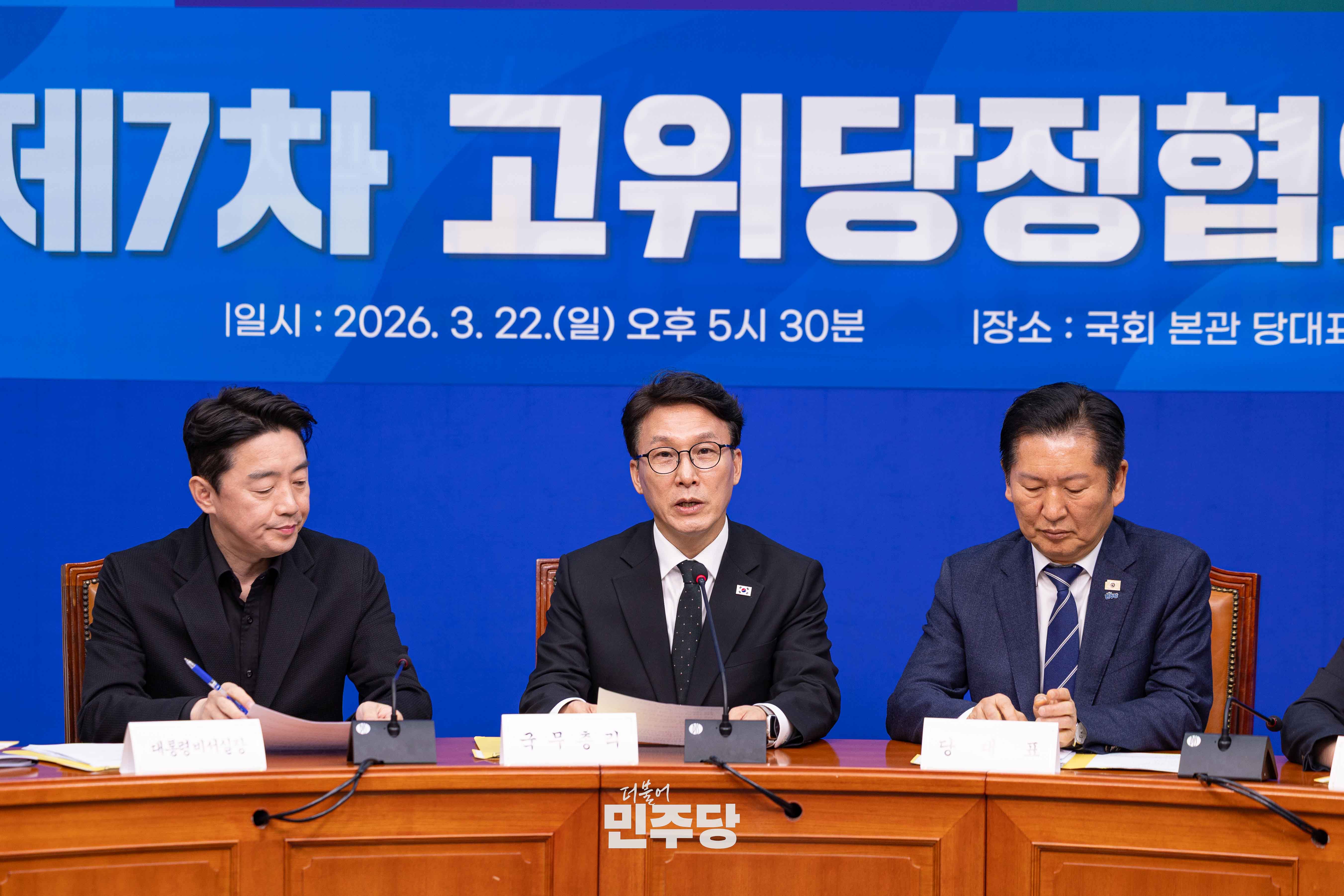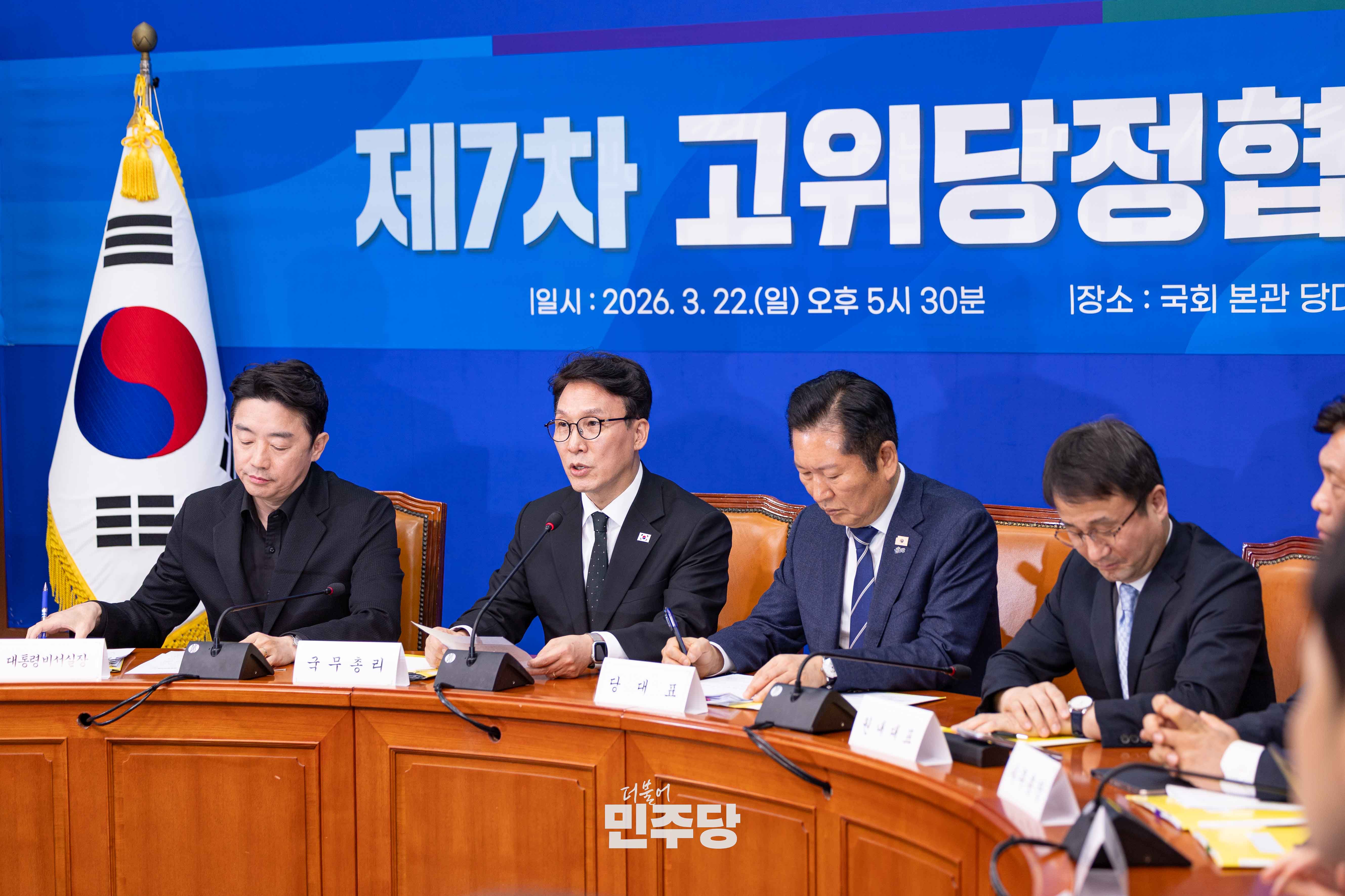 정청래 당대표가 2026.03.22.(일) 국회 본청 당대표회의실에서 진행된 제7차 고위당정협의회에 참석하여 기념촬영을 하고 있다.