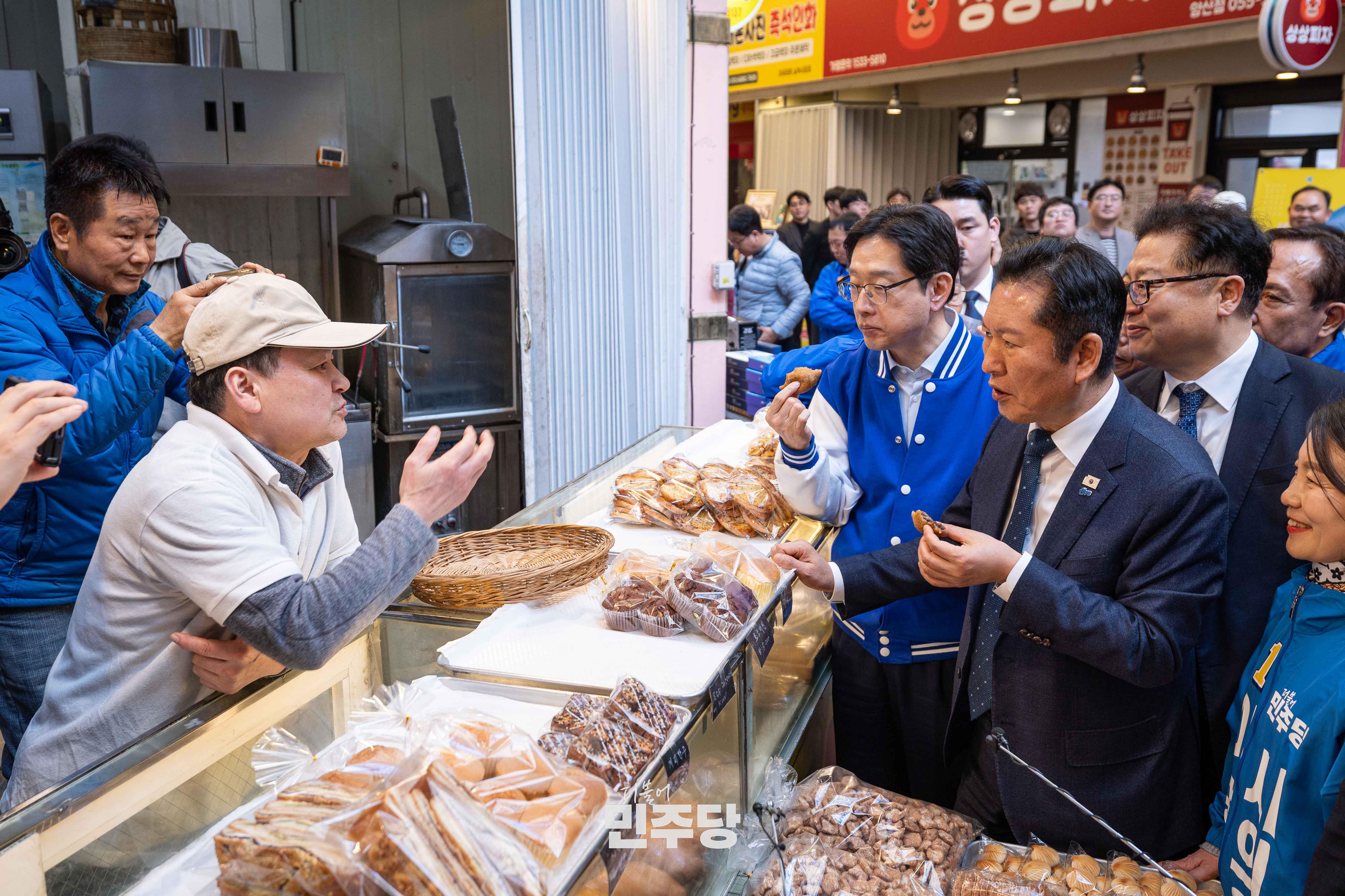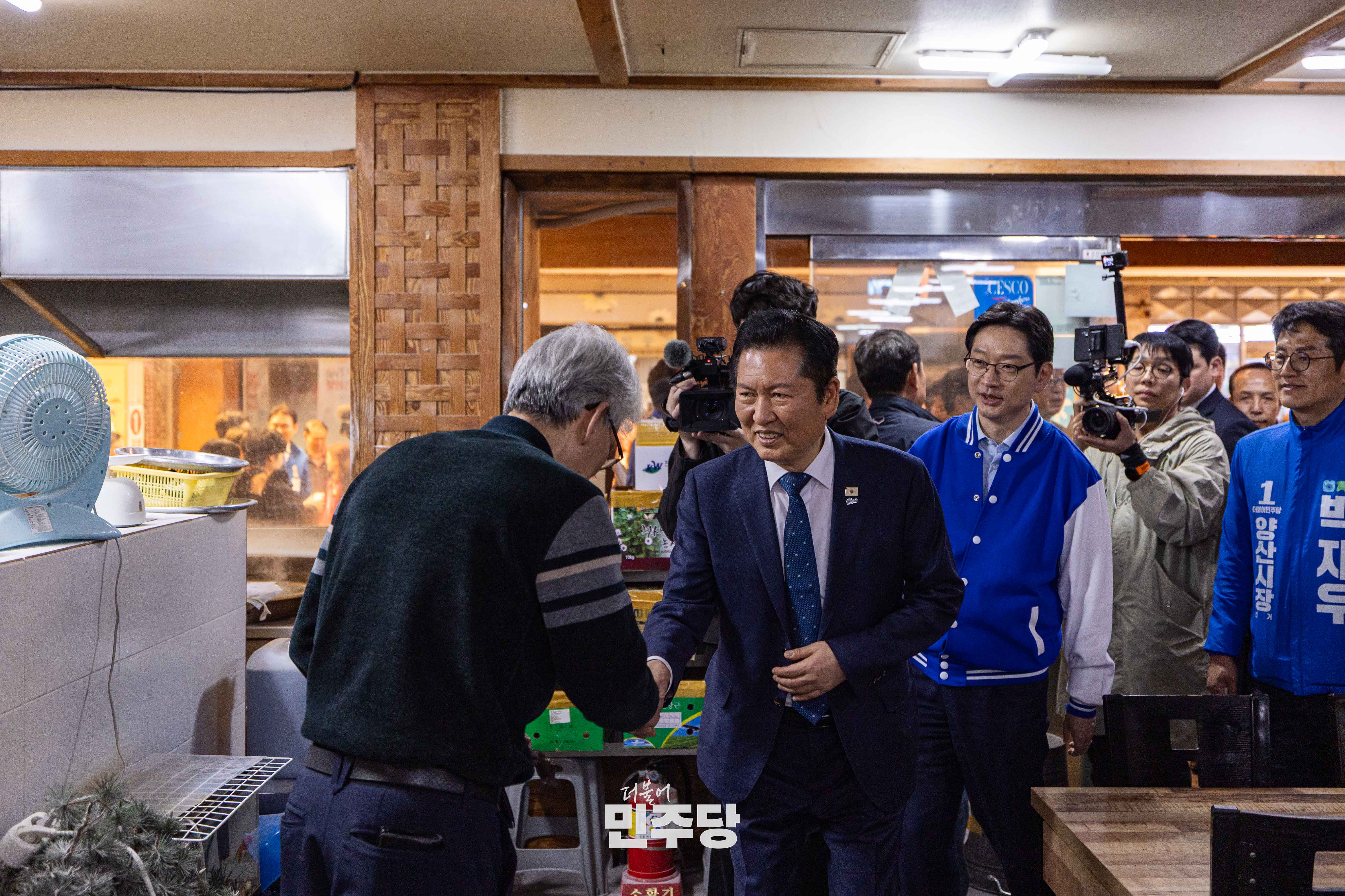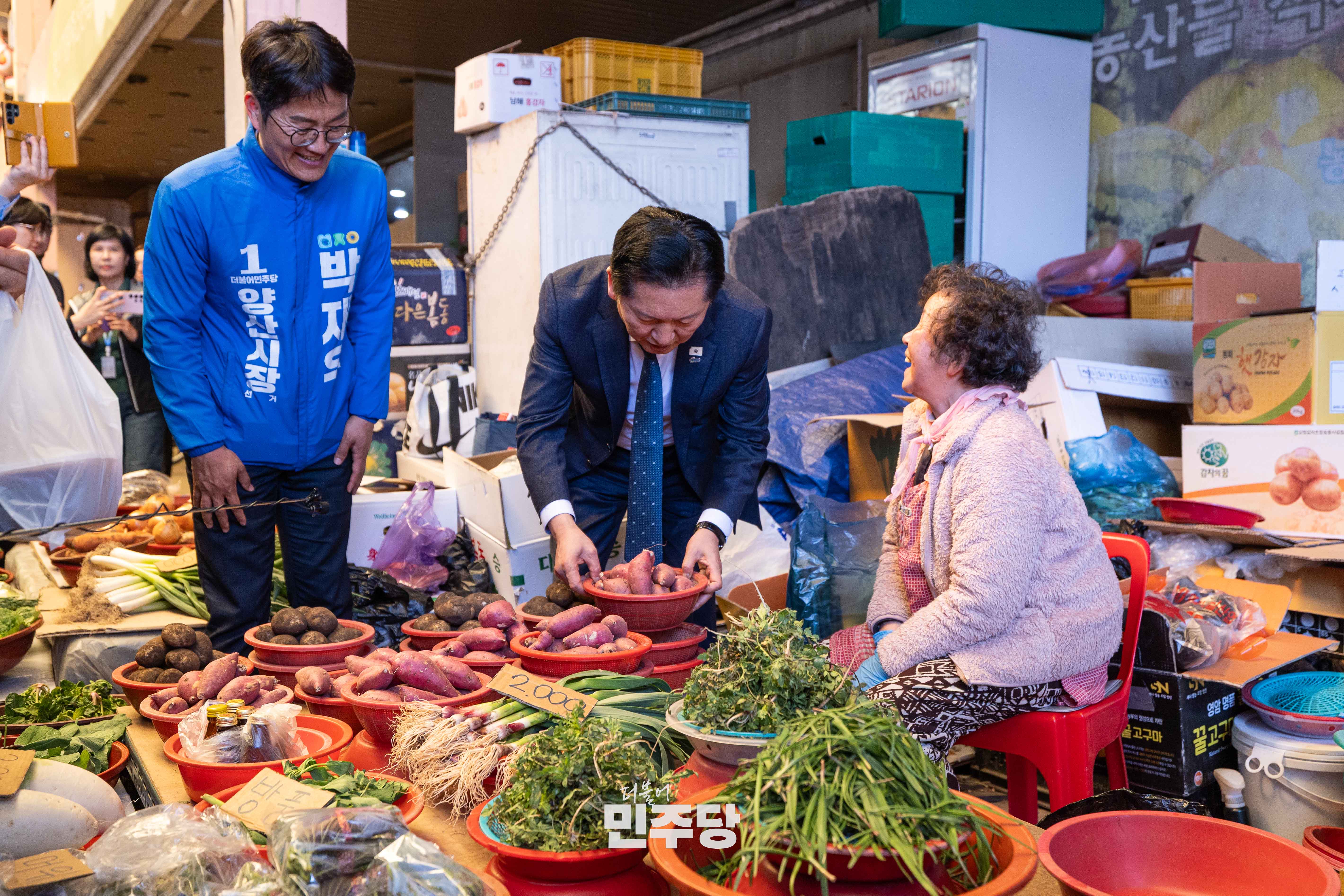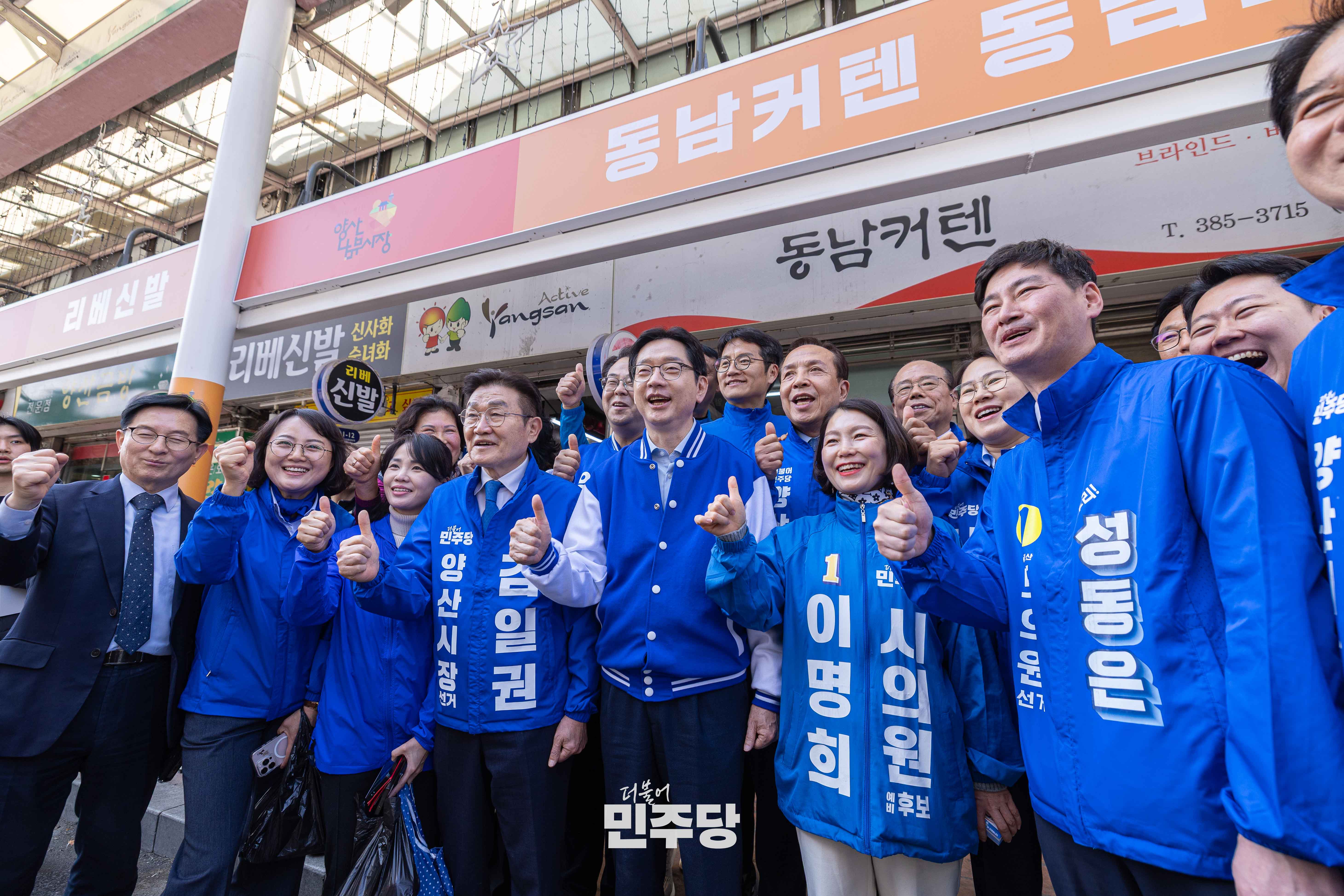 정청래 당대표가 2026.03.23.(월) 경남 양산시에 위치한 남부시장에 방문하여 김경수 전 경남도지사와 상인들과 인사를 나누고 있다.