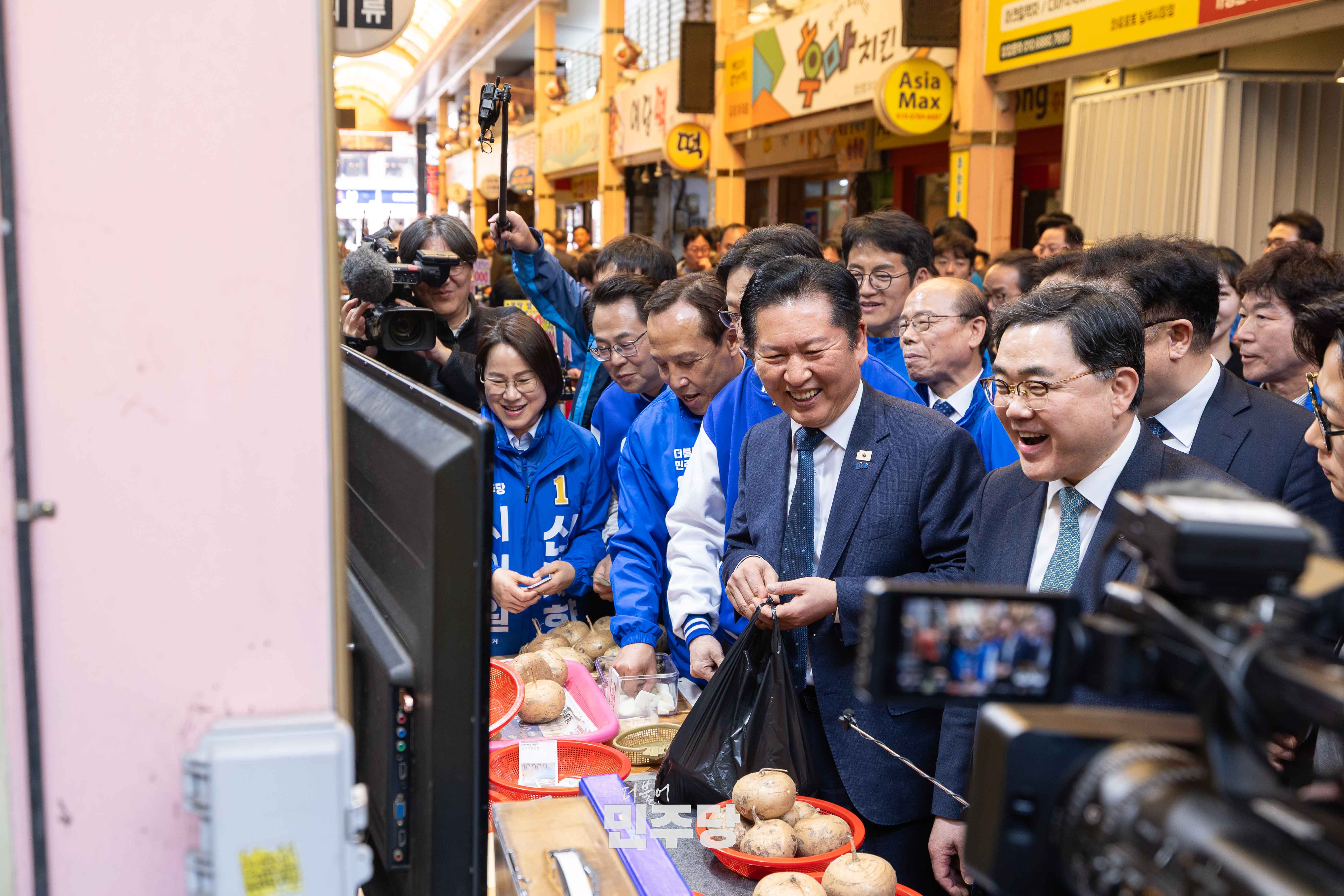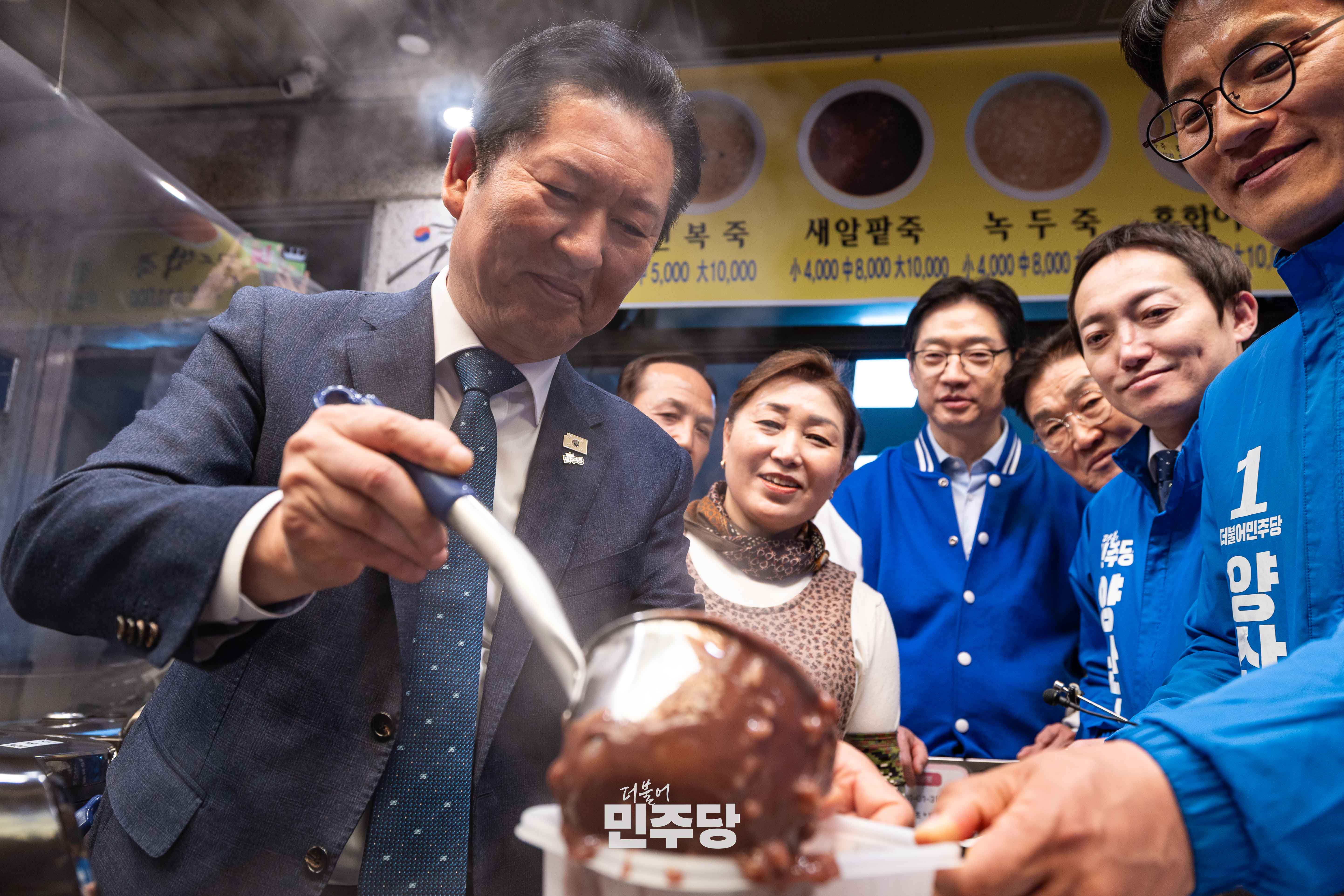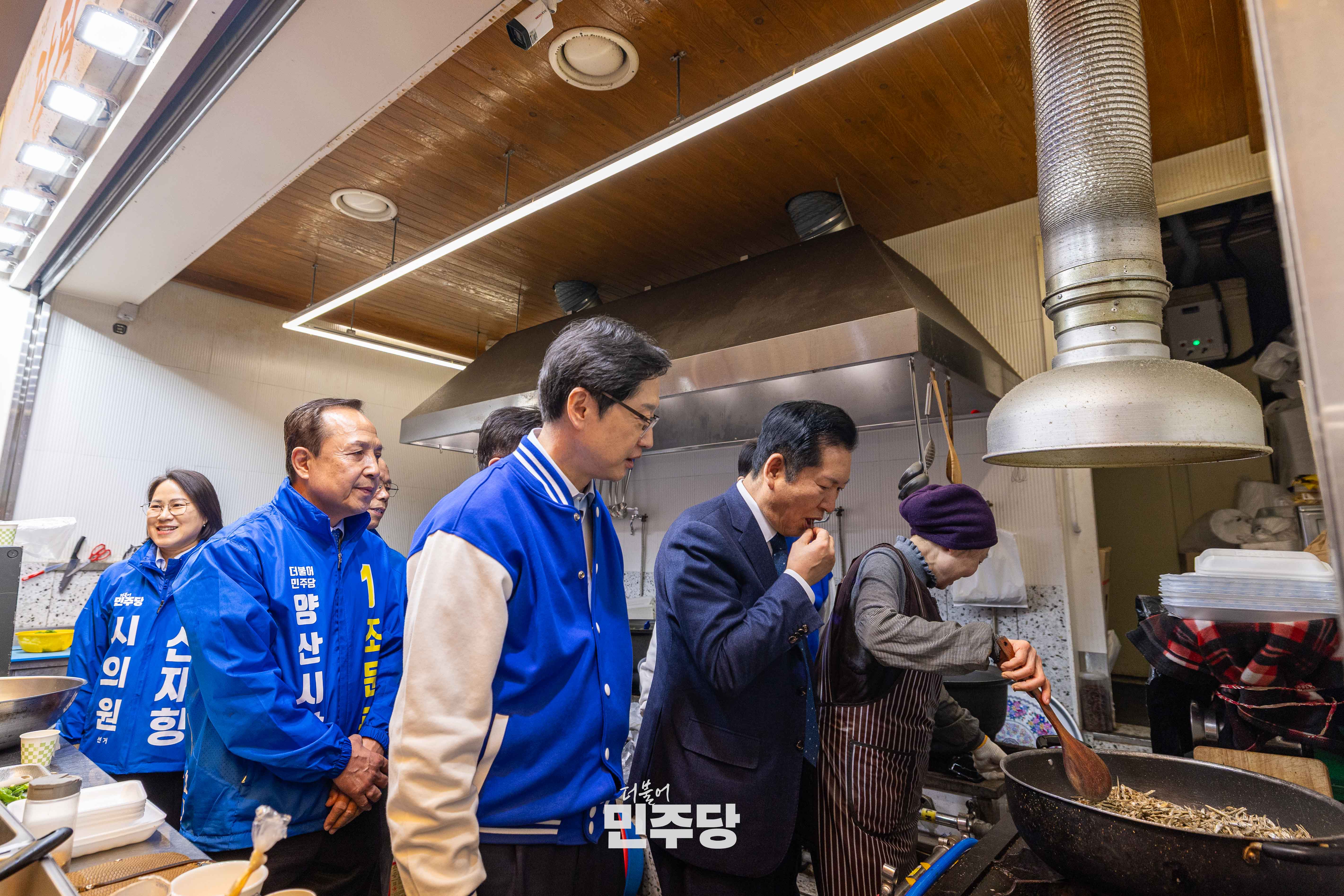 정청래 당대표가 2026.03.23.(월) 경남 양산시에 위치한 남부시장에 방문하여 김경수 전 경남도지사와 상인들과 인사를 나누고 있다.