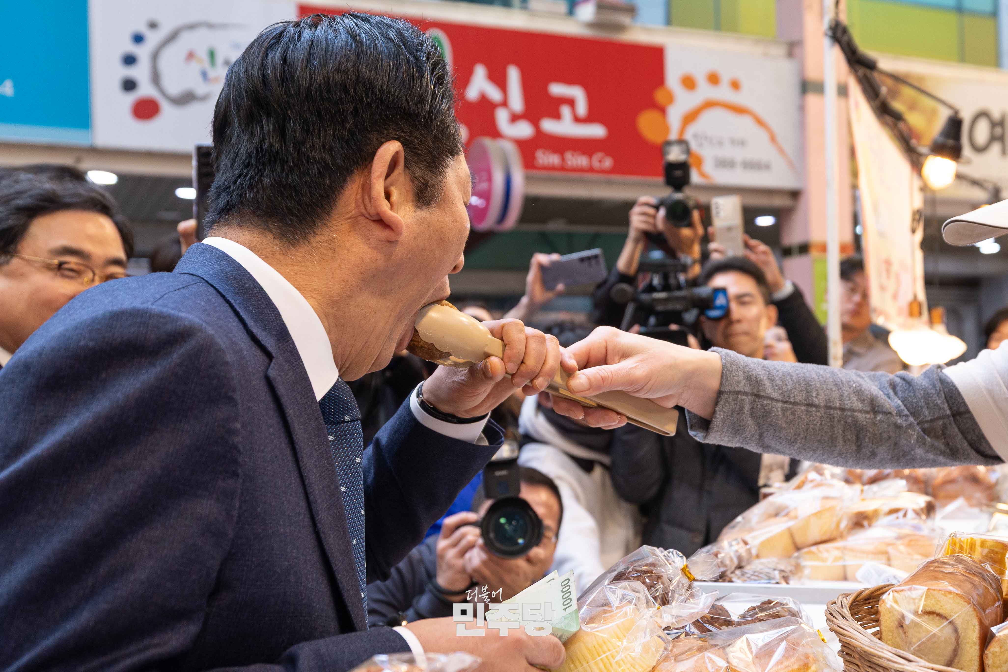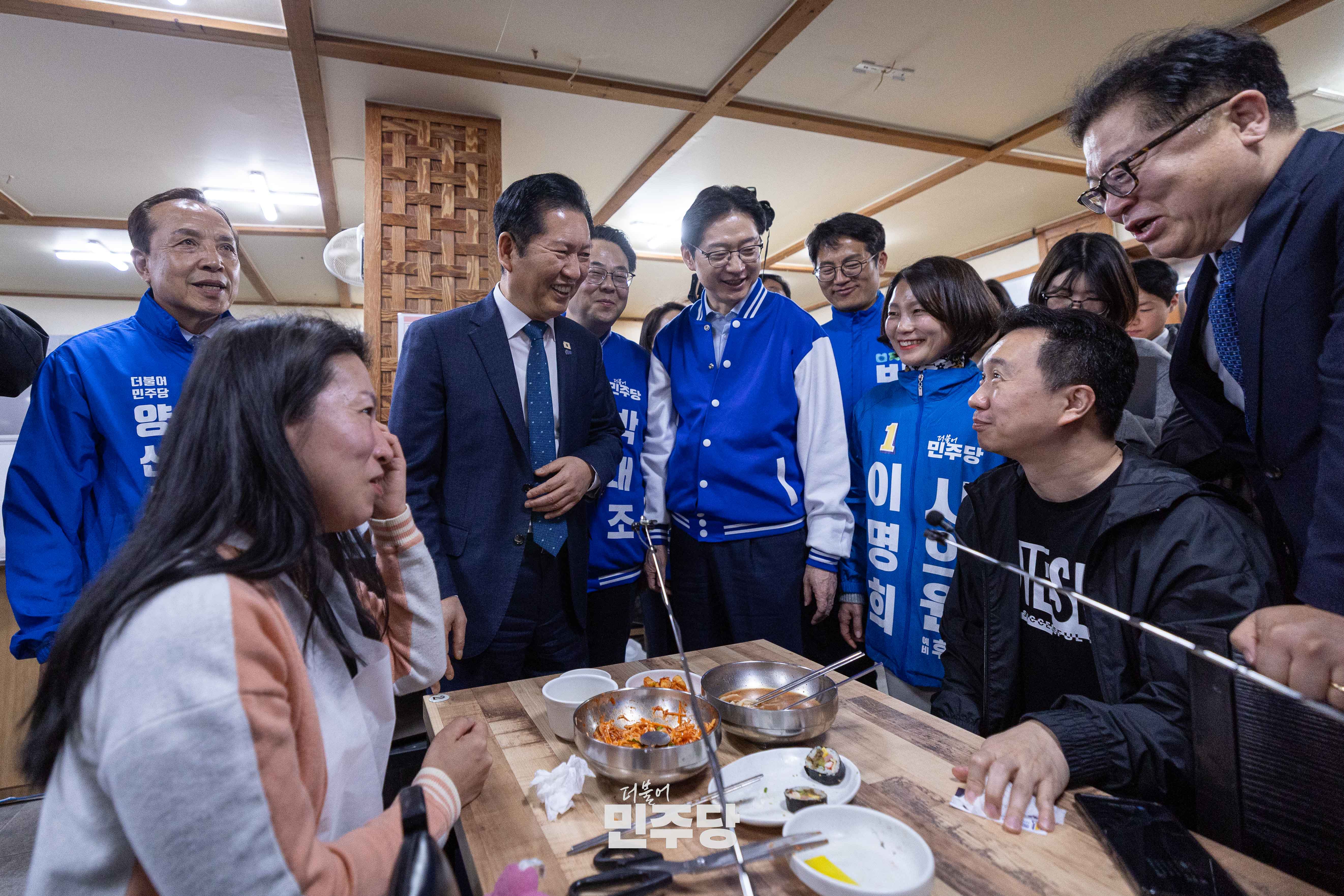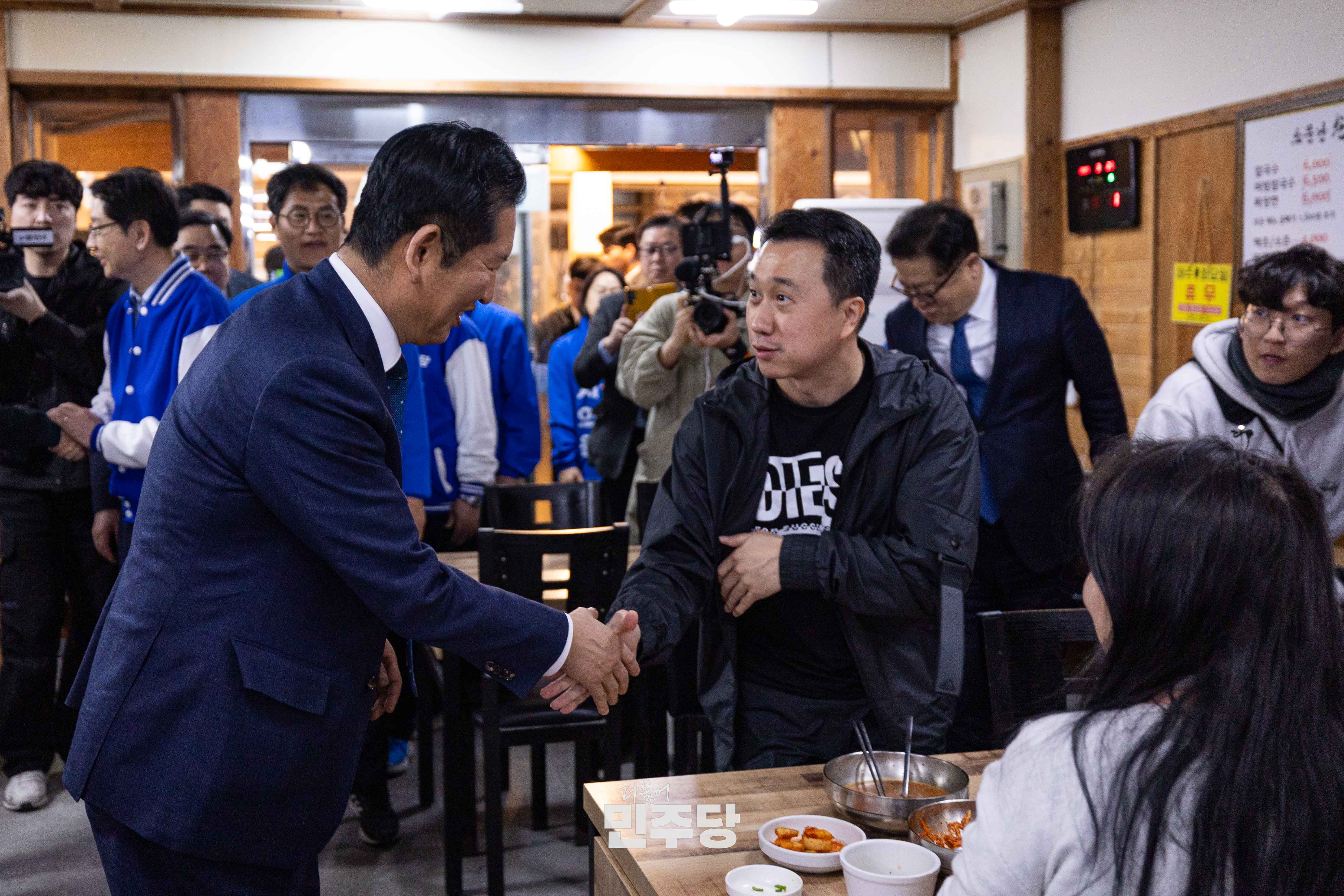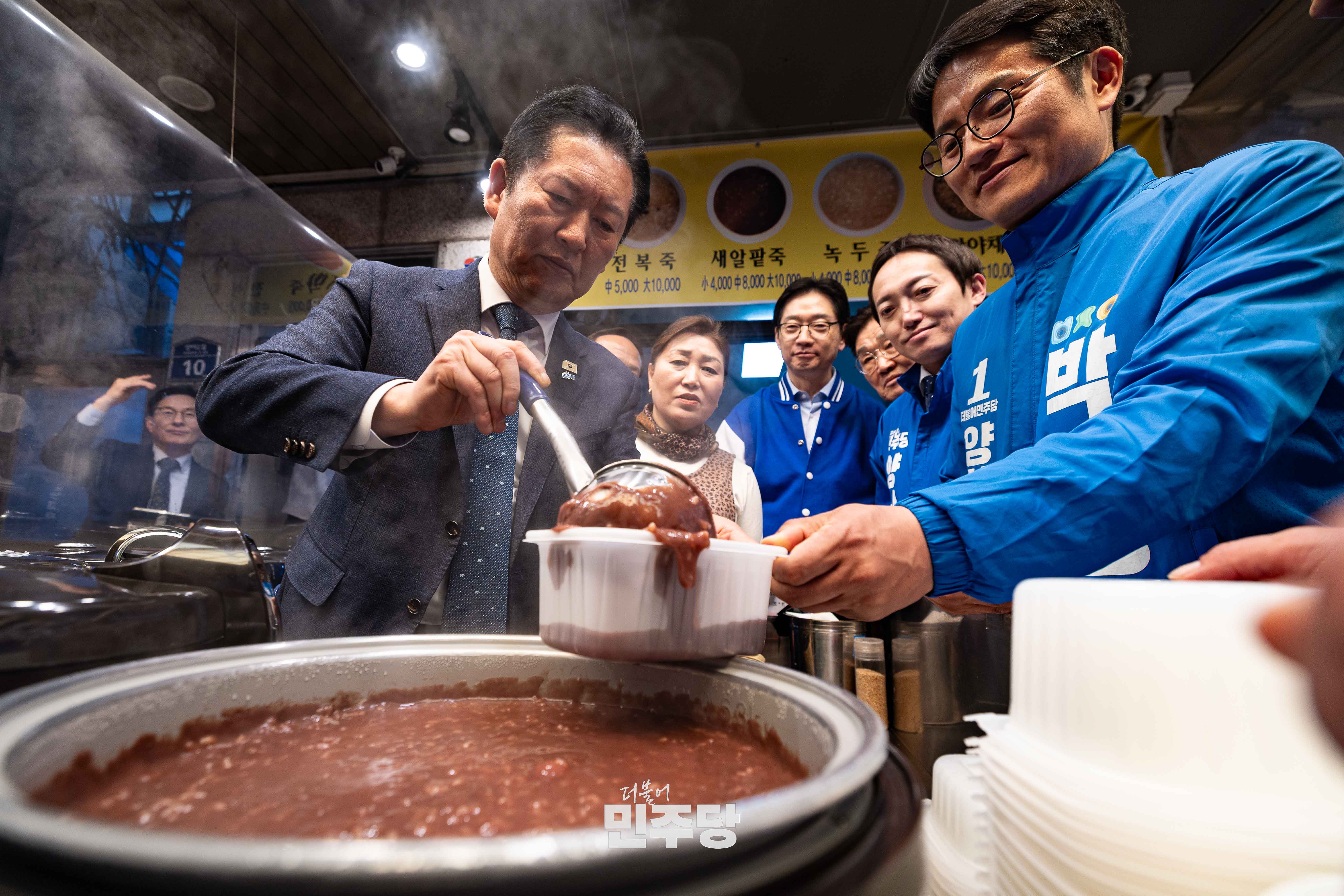 정청래 당대표가 2026.03.23.(월) 경남 양산시에 위치한 남부시장에 방문하여 김경수 전 경남도지사와 상인들과 인사를 나누고 있다.