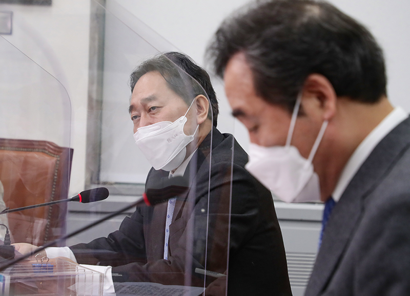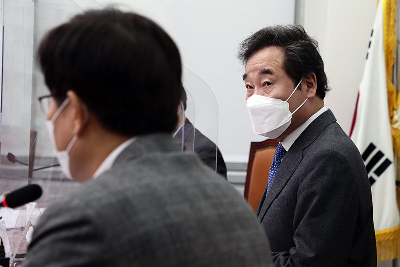 이낙연 당대표가 2021.01.22.(금) 국회 당대표회의실에서 열린 소확행위원회-금융비용 절감 상생 협약식에 참석하여 기념촬영을 하고 있다.