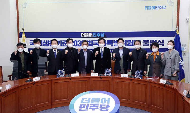 이낙연 당대표가 2021.02.26.(금) 국회 당대표회의실에서 열린 국민생활기준 2030 범국민특별위원회 출범식에 참석하여 기념촬영을 하고 있다.
