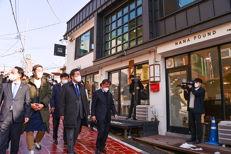 이낙연 당대표가 2021.03.05.(금) 춘천시에 위치한 육림고개 및 중앙시장을 방문하여 간담회를 하고 있다.