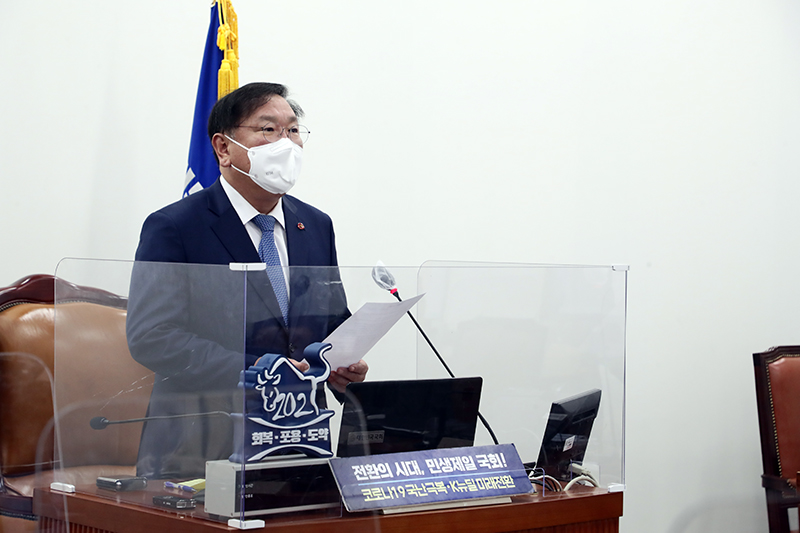 김태년 당대표 직무대행이 2021.04.08.(목) 국회 220호에서 열린 화상의원총회를 주재하고 있다.
