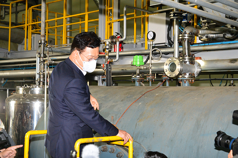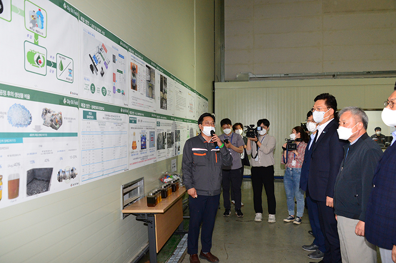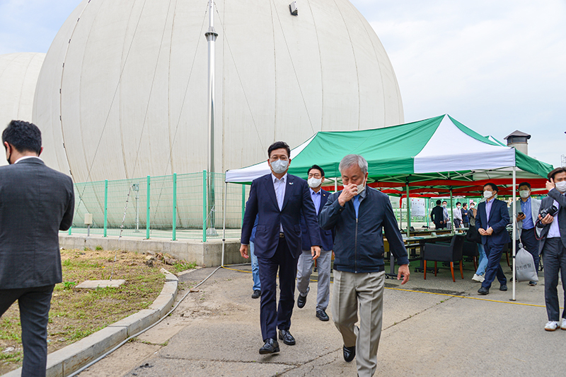 송영길 당대표가 2021.06.07.(월) 인천 서구에 위치한 수도권매립지관리공사에 재생에너지 연구시설 현장방문하여 설명을 듣고 있다.