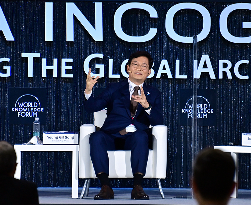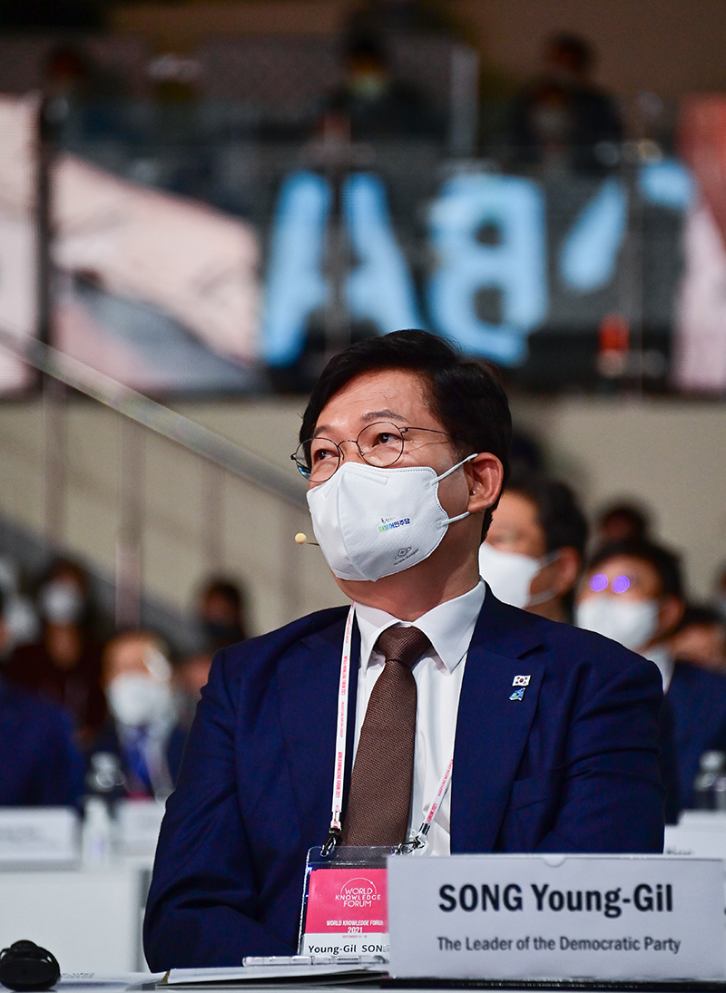 송영길 당대표가 2021.09.14.(화) 중구 장충아레나에서 열린 제22회 세계지식포럼 개막식 및 마이클 샌델과의 대담에 참석하여 발언을 하고 있다.