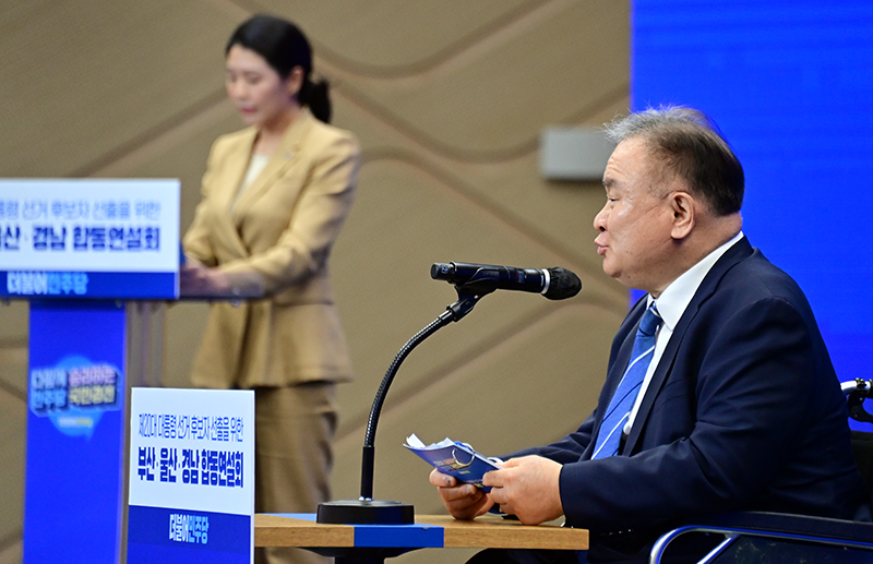 송영길 당대표가 2021.10.02.(토) 부산에 위치한 부산항국제전시컨벤션센터에서 열린 부산·울산·경남 순회경선에 참석하여 모두발언을 하고 있다.