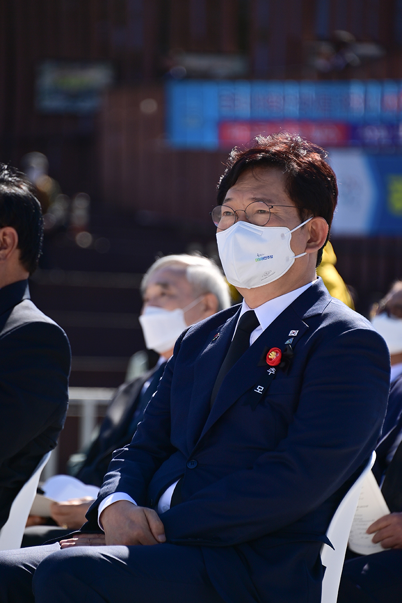 송영길 당대표가 2021.10.19.(화) 여수시에 위치한 이순신광장에서 진행한 여순사건 제73주기 합동위령제 및 추념식에 참석하여 추념사를 하고 있다.