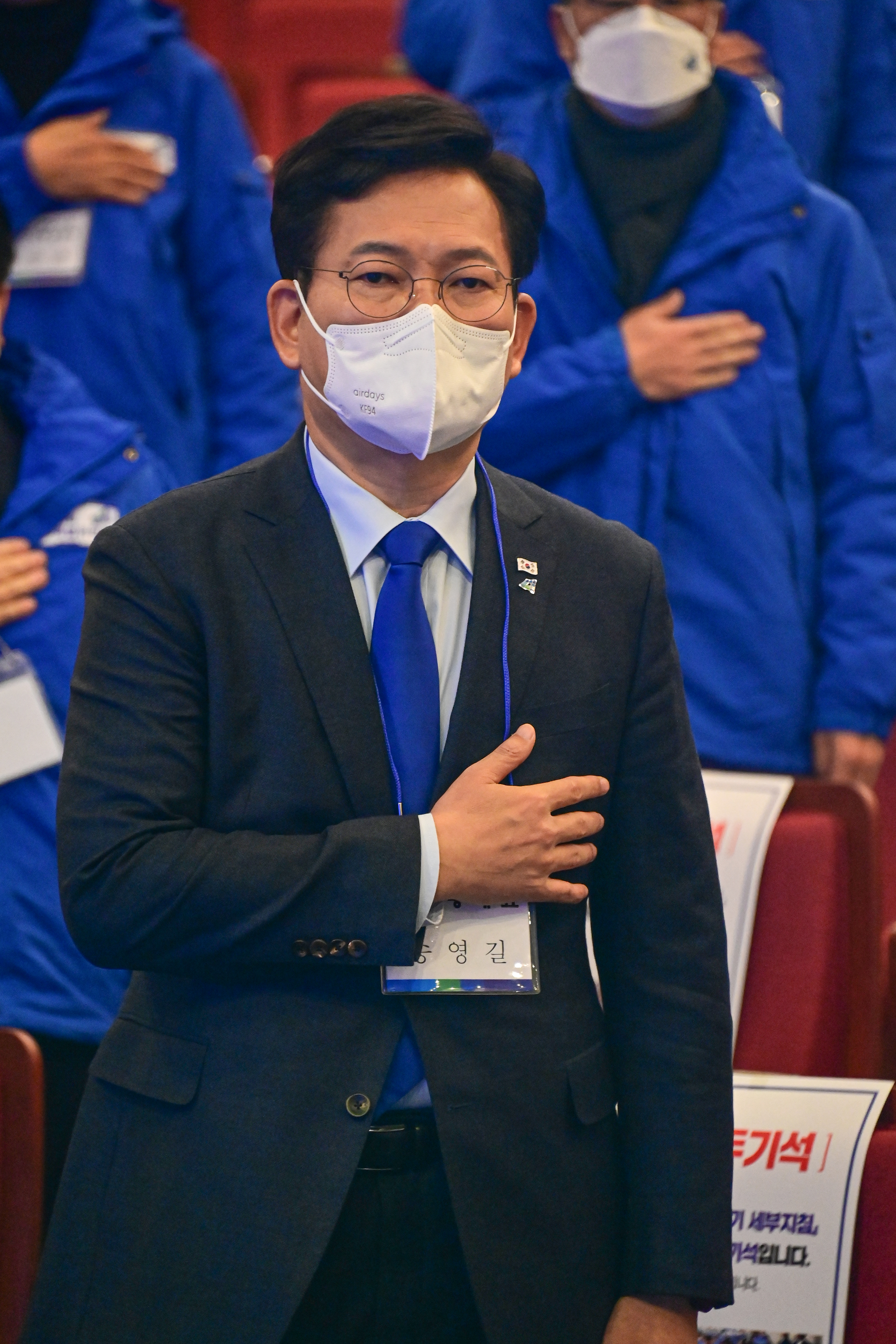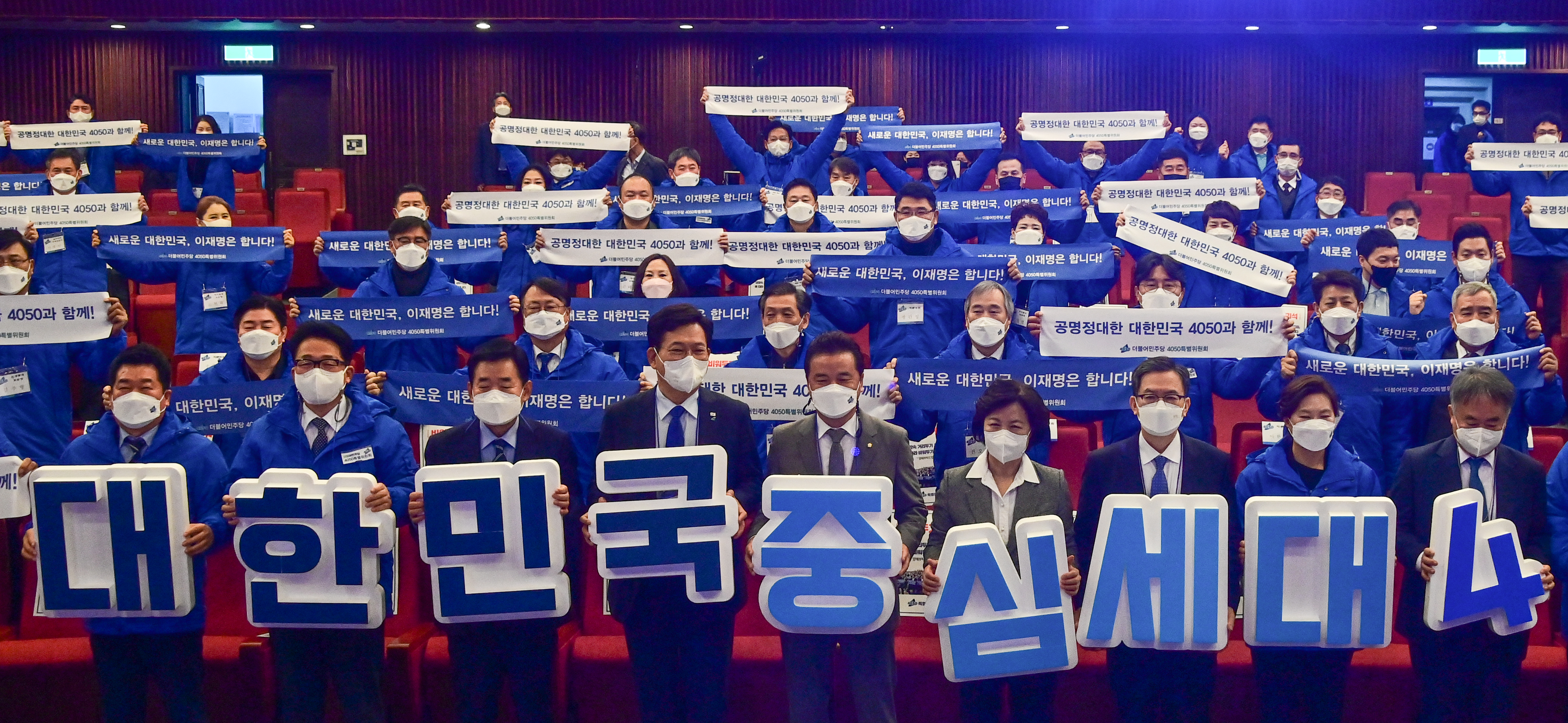 송영길 상임선대위원장이 2021.11.22.(월) 국회도서관 대회의실에서 열린 4050특위 제3기 및 대전환 선대위 4050본부 출범식에 참석하여 기념촬영을 하고 있다.