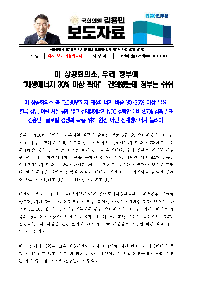 [김용민의원실 보도자료] 미 상공회의소, 우리 정부에 “재생에너지 30% 이상 확대” 건의했는데 정부는 쉬쉬
