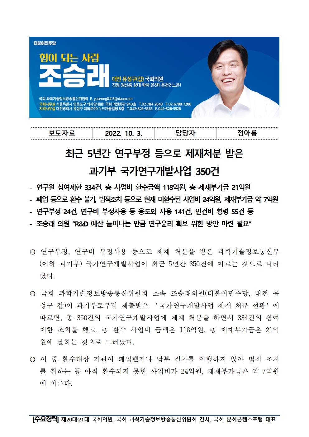 [국회의원 조승래] 최근 5년간 연구부정 등으로 제재처분 받은 과기부 국가연구개발사업 350건