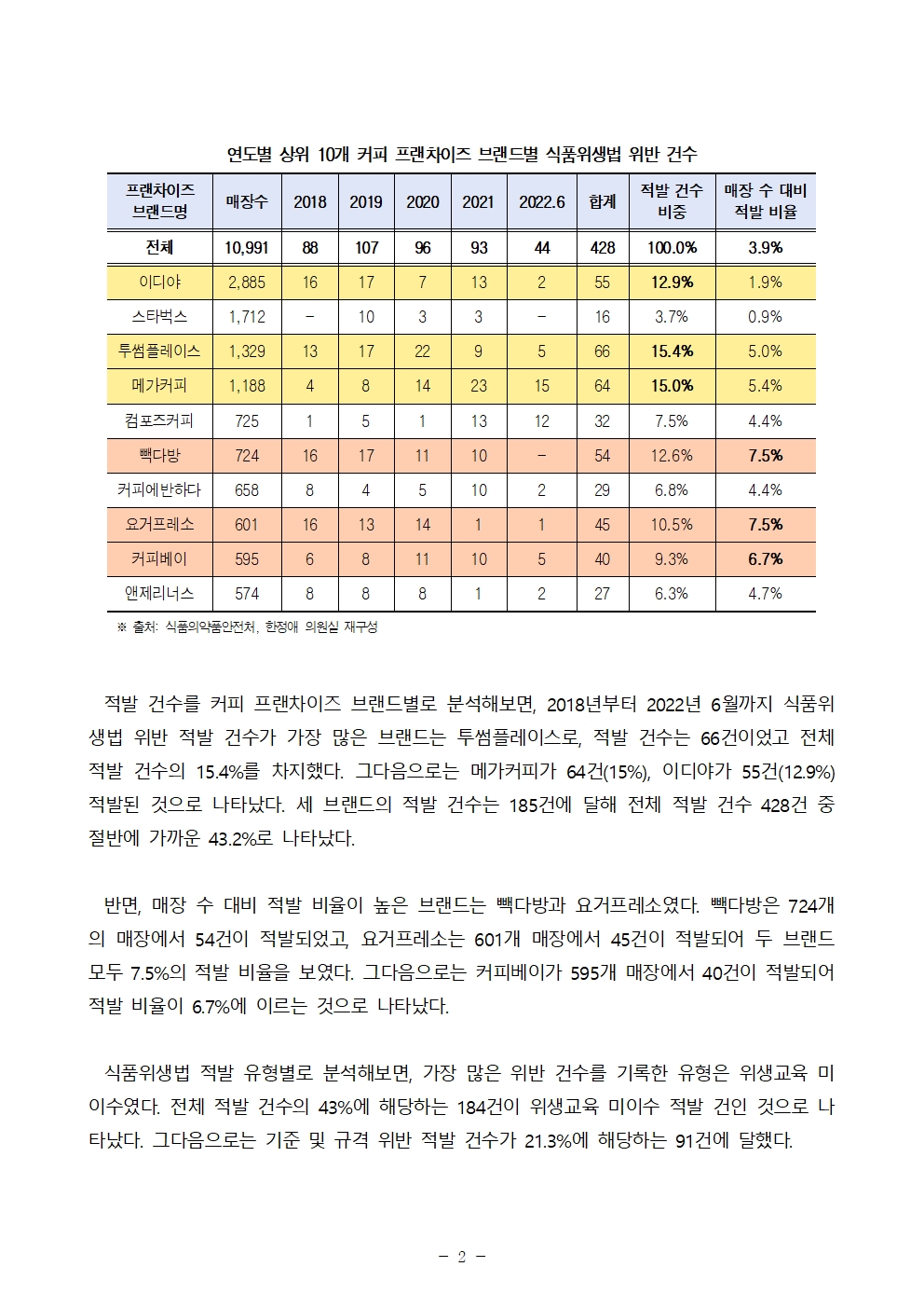 220922_한정애_의원_보도자료_커피_프랜차이즈_식품위생법_위반_연간_100여_건.hwp