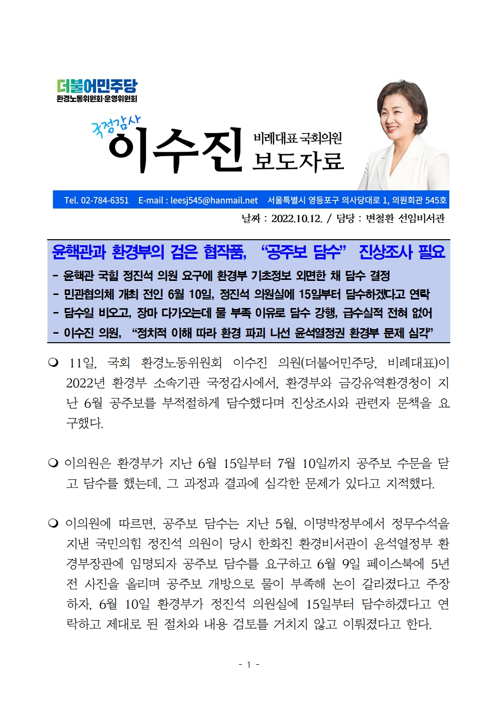 이수진 의원(비) 보도자료] 윤핵관과 환경부의 검은 협작품, “공주보 담수” 진상조사 필요
