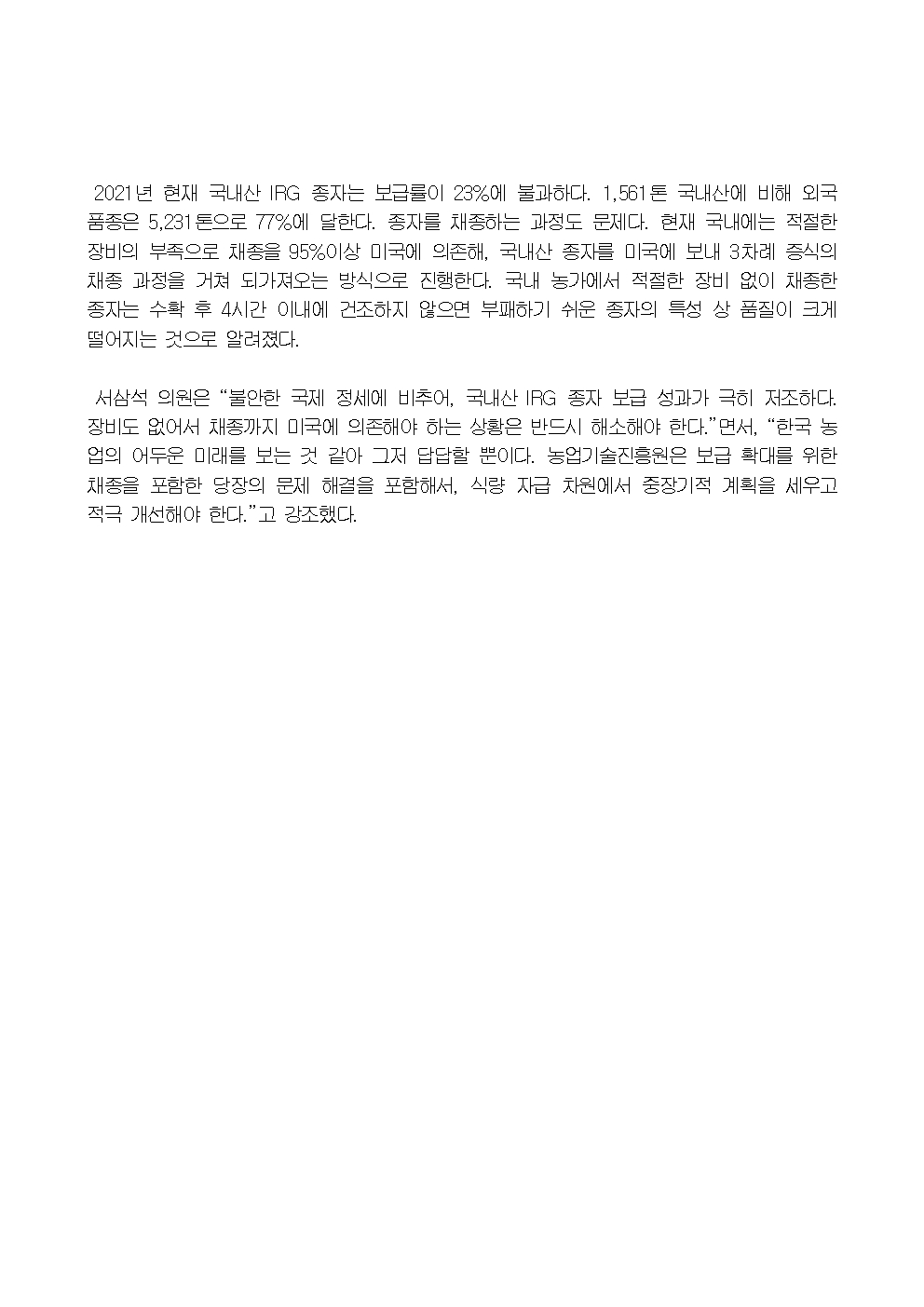 [국회의원 서삼석] 서삼석 “ 사료자급 위해 간척지 유휴지 적극 활용해야 ”