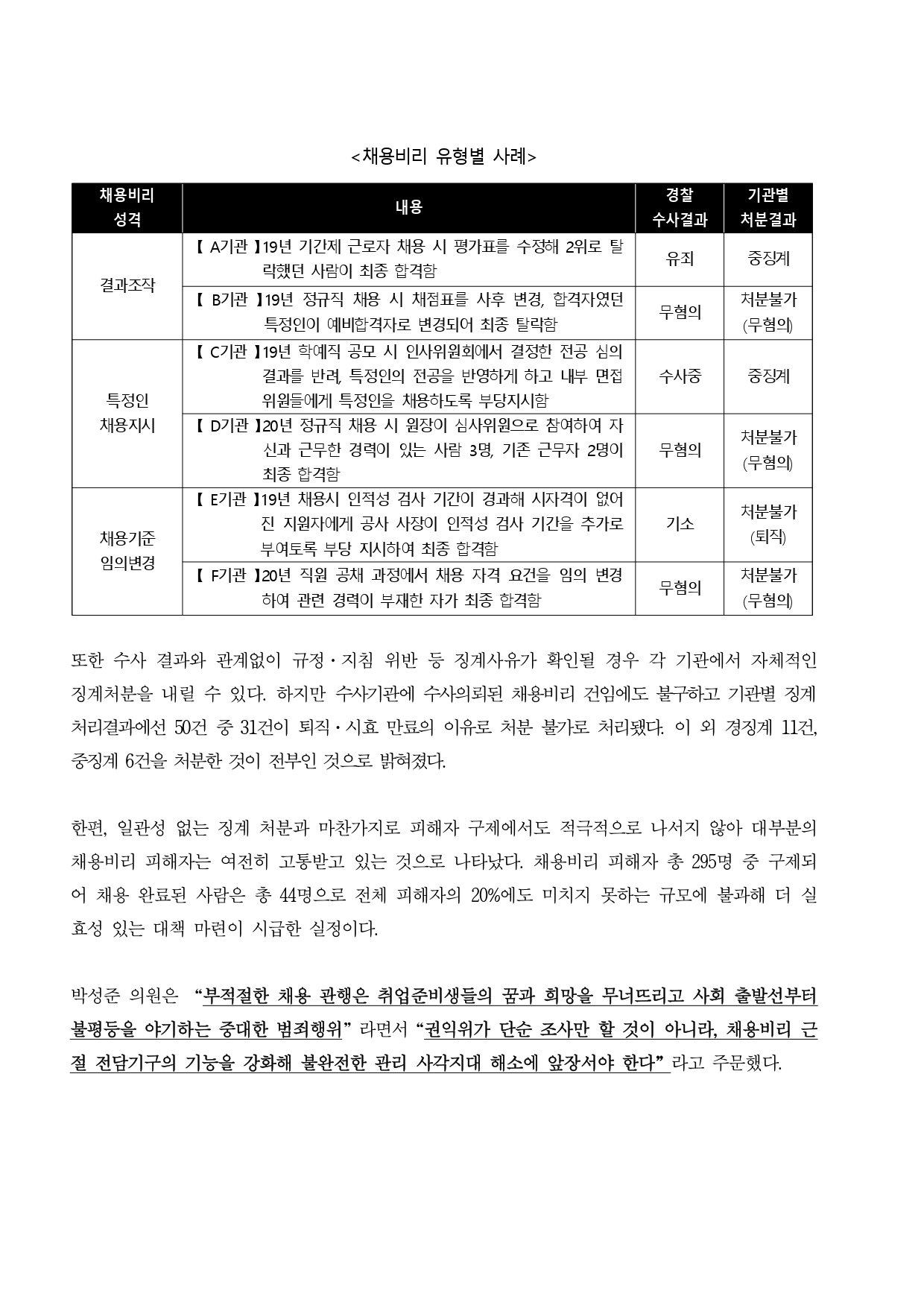 [국회의원 박성준] 권익위, 공공기관 채용비리 근절대책 마련해야