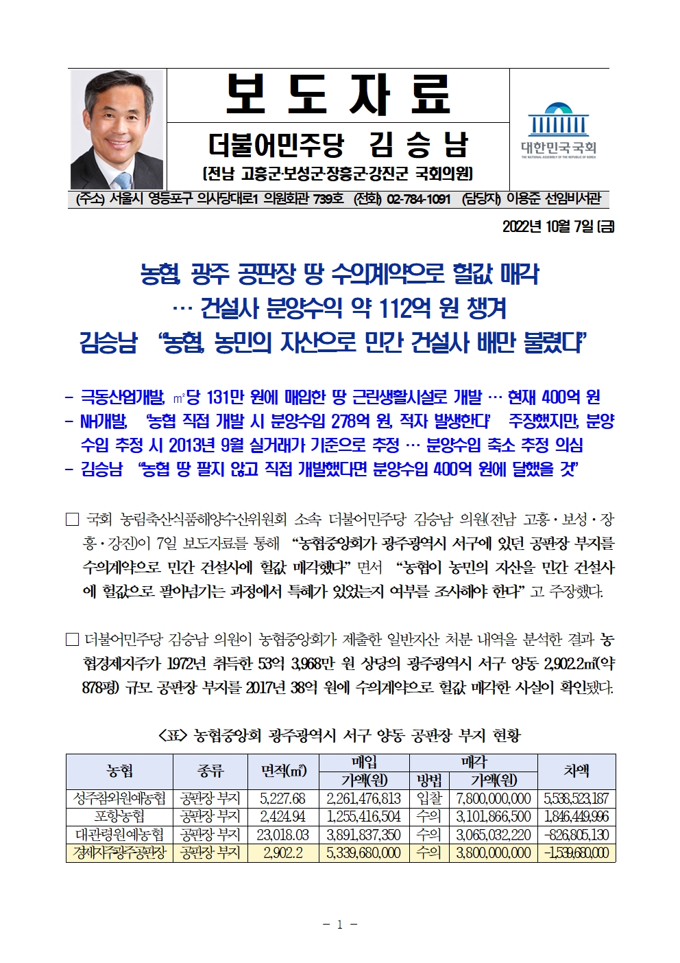 국감_보도자료_20221007_보도자료_김승남_의원_농협_수의계약으로_공판장_부지_건설사에_헐값_매각.hwp
