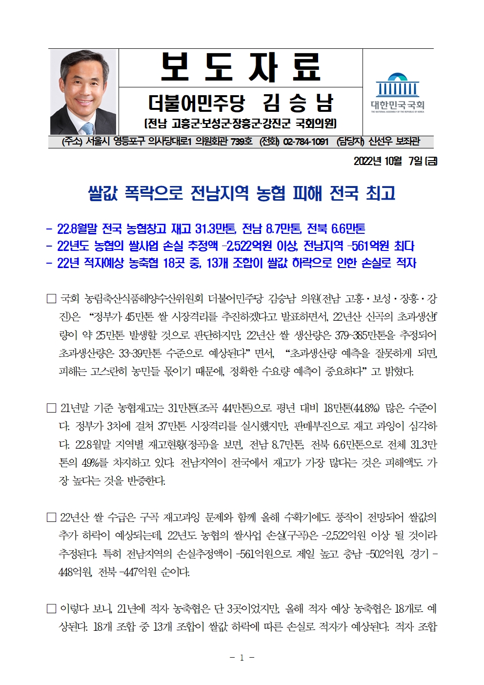 국감_보도자료_20221007_보도자료_쌀값_폭락으로_전남지역_농협_피해_전국_최고.hwp