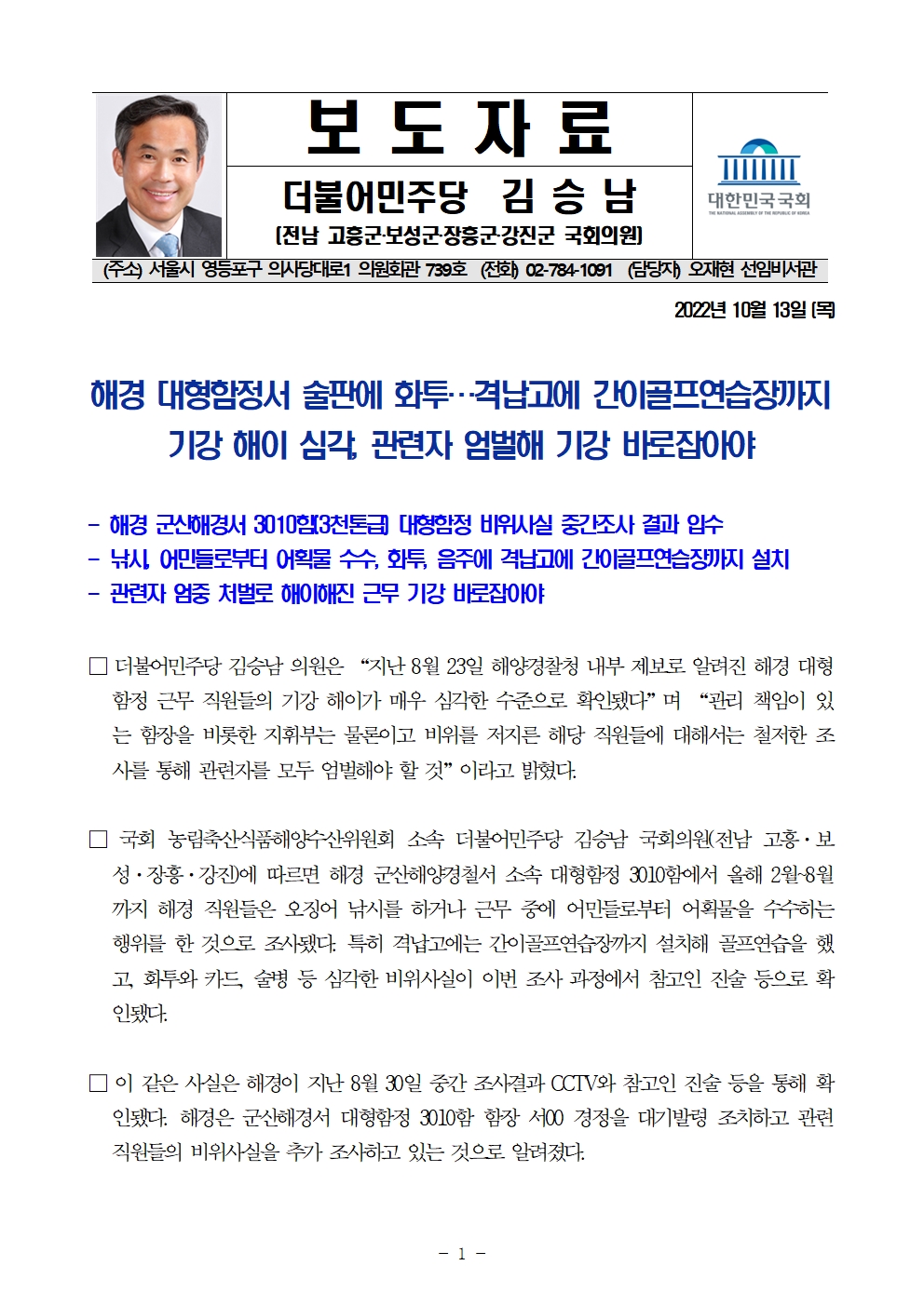 [김승남 보도자료] 해경 대형함정서 술판에 화투…격납고에 간이골프연습장까지 기강 해이 심각, 관련자 엄벌해 기강 바로잡아야