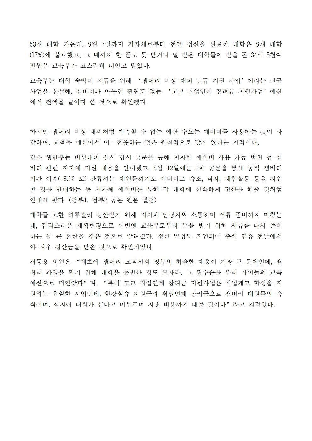 [서동용 의원] “잼버리 뒷수습, 결국 교육부가 수습해라” 교육부 고교취업연계 장려금으로 잼버리대원 숙박비 35억 지급