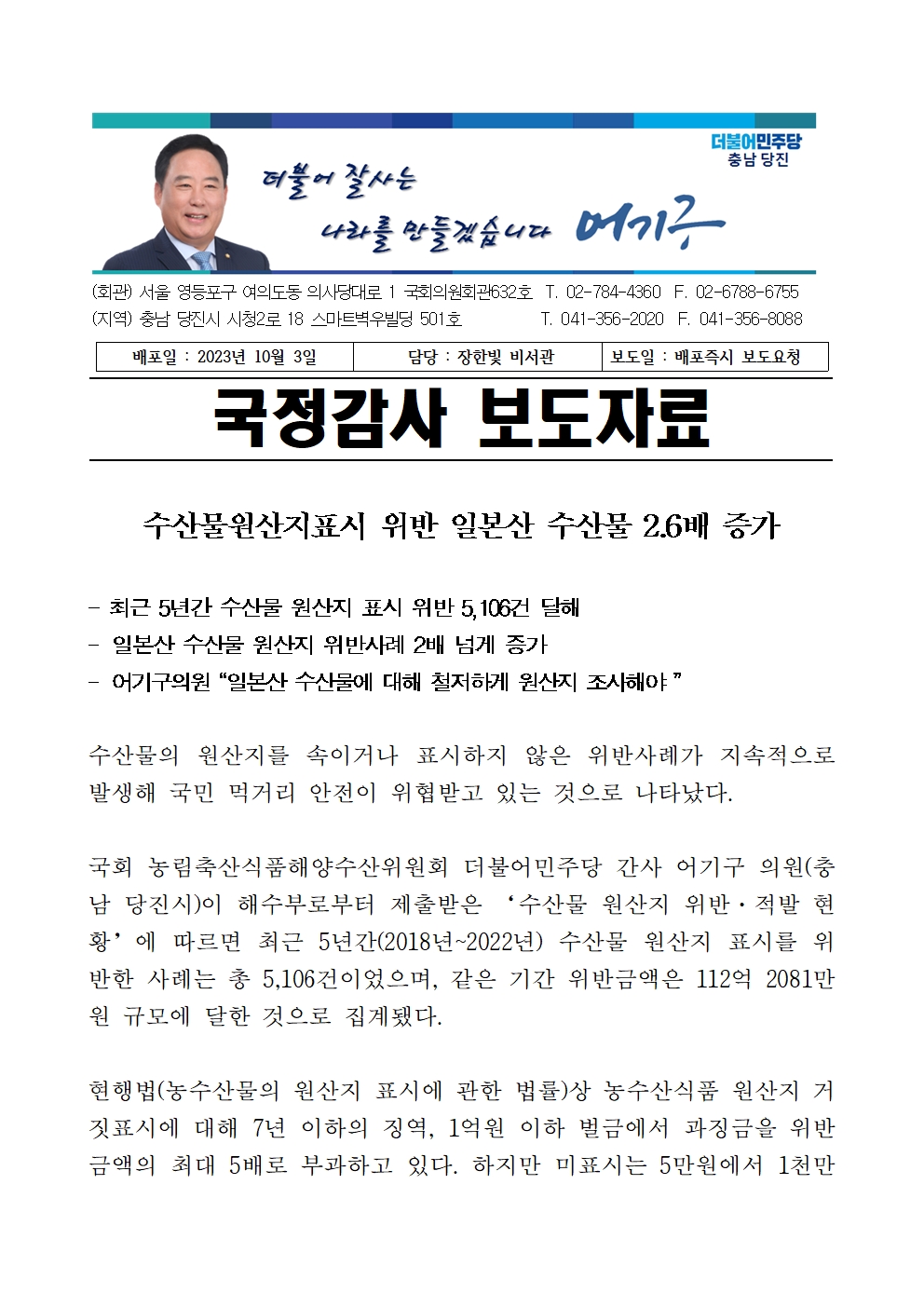 231003 [어기구의원 국정감사 보도자료] 수산물원산지표시 위반 일본산 수산물 2.6배 증가.hwp