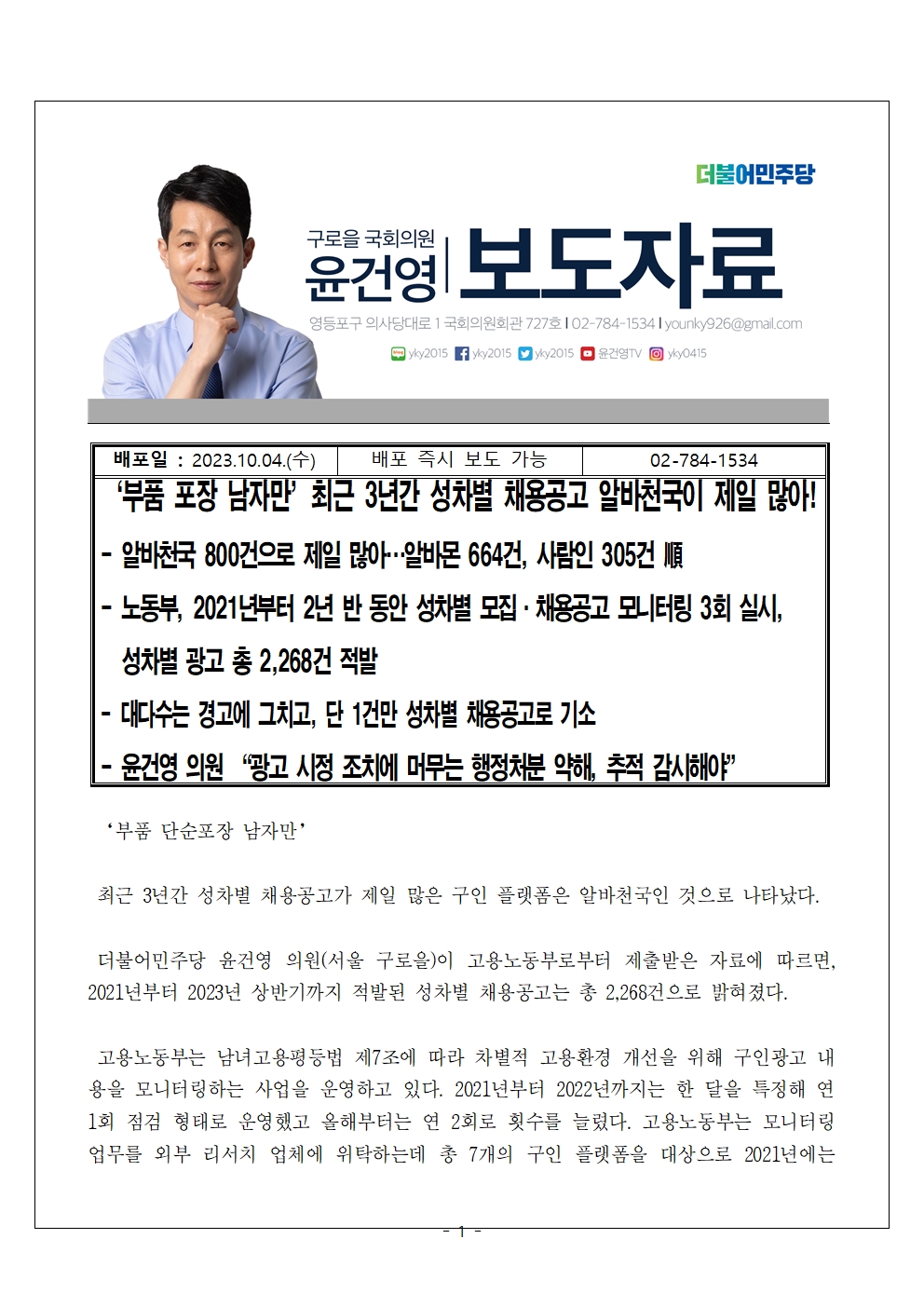 [국회의원 윤건영 보도자료] ‘부품 포장 남자만’최근 3년간 성차별 채용공고 알바천국이 제일 많아!