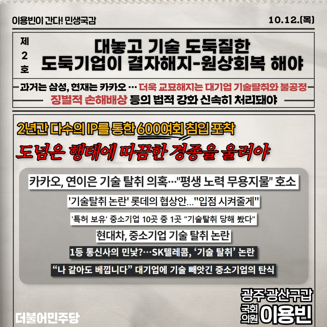 기술탈취를 중대 범죄로 다루고, 성과물 등에 대한 특허청 및 중기부 차원에서의 등록시스템을 구축‧관리하는 한편, 제가 발의한 징벌적 손해배상제 통과에 힘써 처벌을 강화할 것을 장관과 청장에게 촉구했습니다.