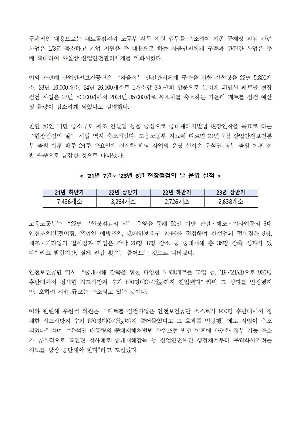 231002_보도자료_윤석열_정부의_중대재해처벌법_‘약화시도’_현실로_드러나_패트롤점검_절반으로축소_1고.hwp