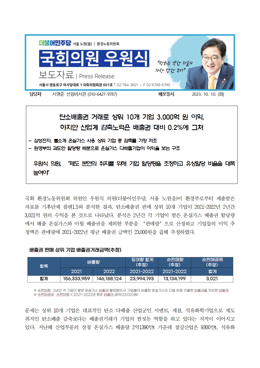 서231010_우원식보도자료_탄소배출권_거래로_상위_10개_기업_3000억_원_이익.hwp