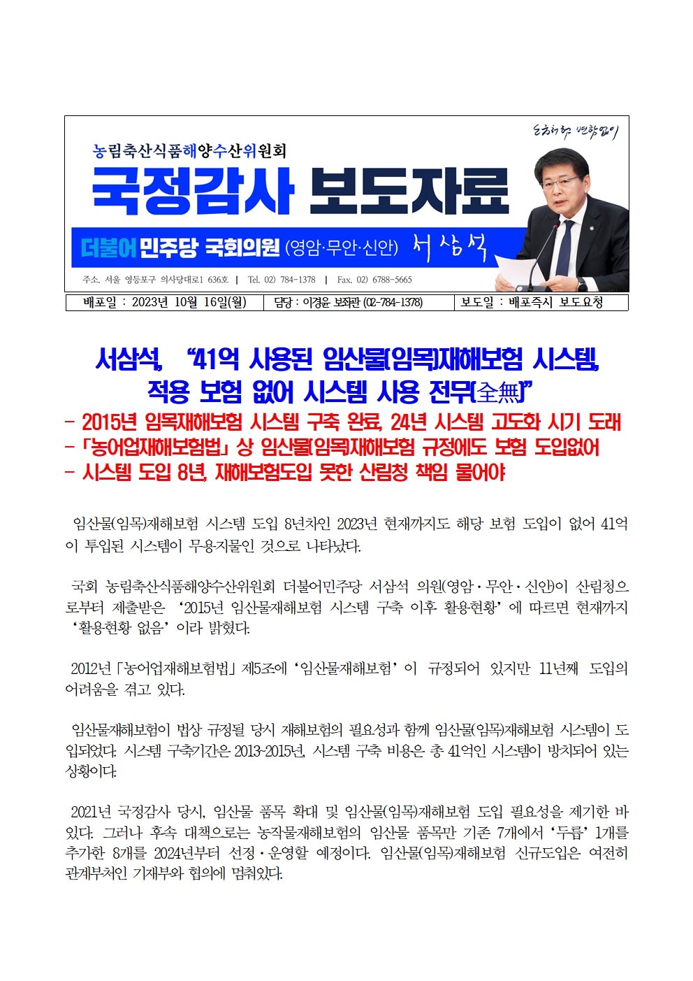 231016_[서삼석 국회의원] 서삼석 “41억 사용된 임산물(임목)재해보험 시스템 적용 보험 없어 시스템 사용 전무.hwp