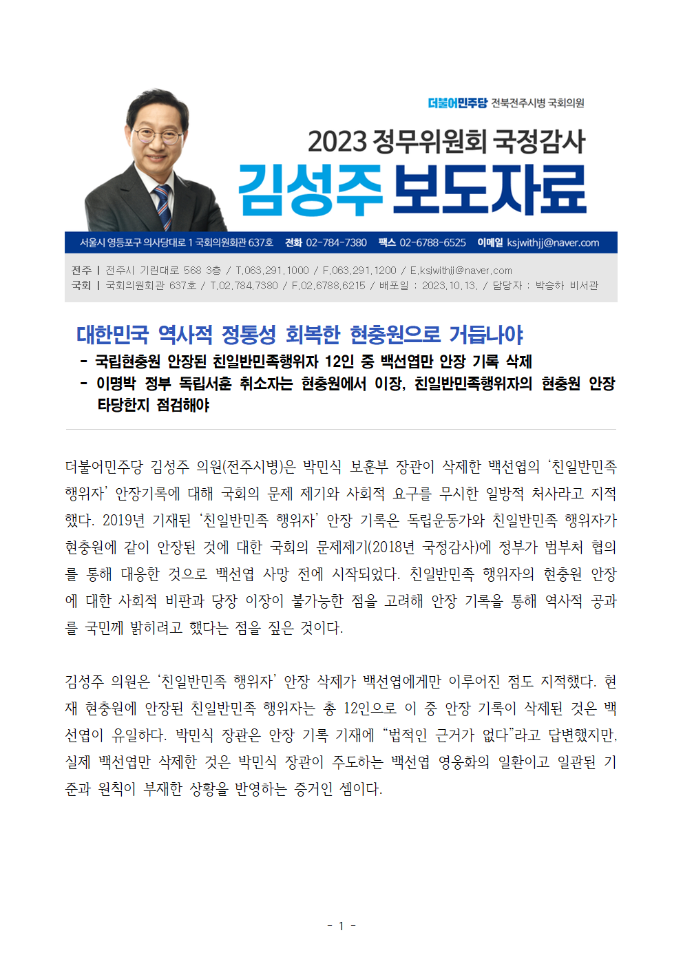 [김성주의원 보도자료] 대한민국 역사적 정통성 회복한 현충원으로 거듭나야