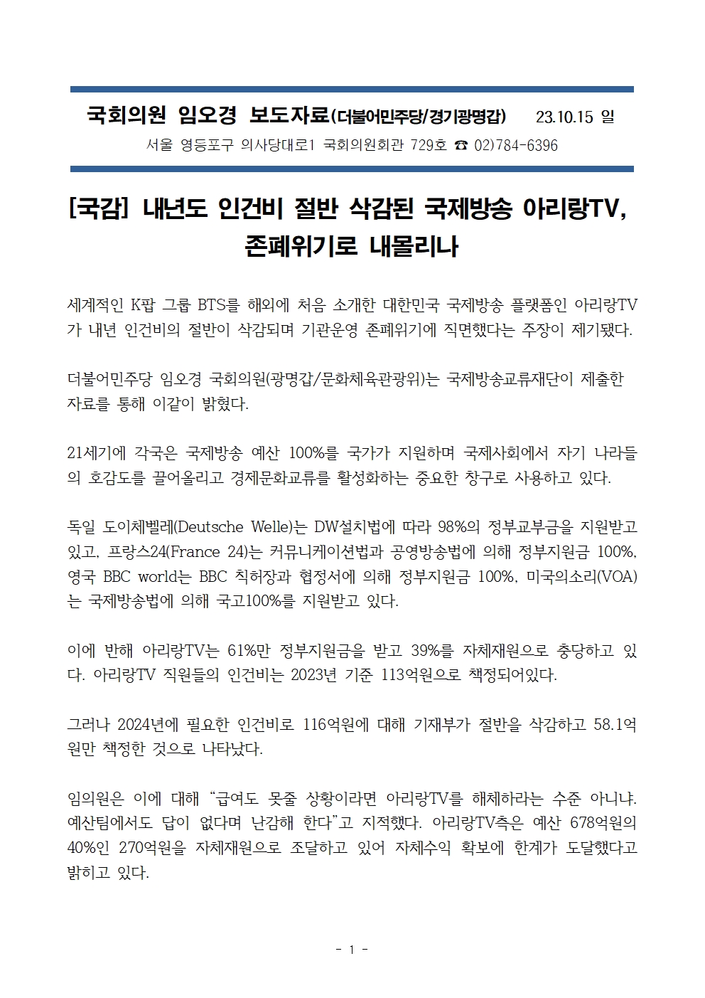 [23.10.15_임오경의원 국감보도자료]내년도 인건비 절반 삭감된 국제방송 아리랑TV 존폐위기로 내몰리나.hwp