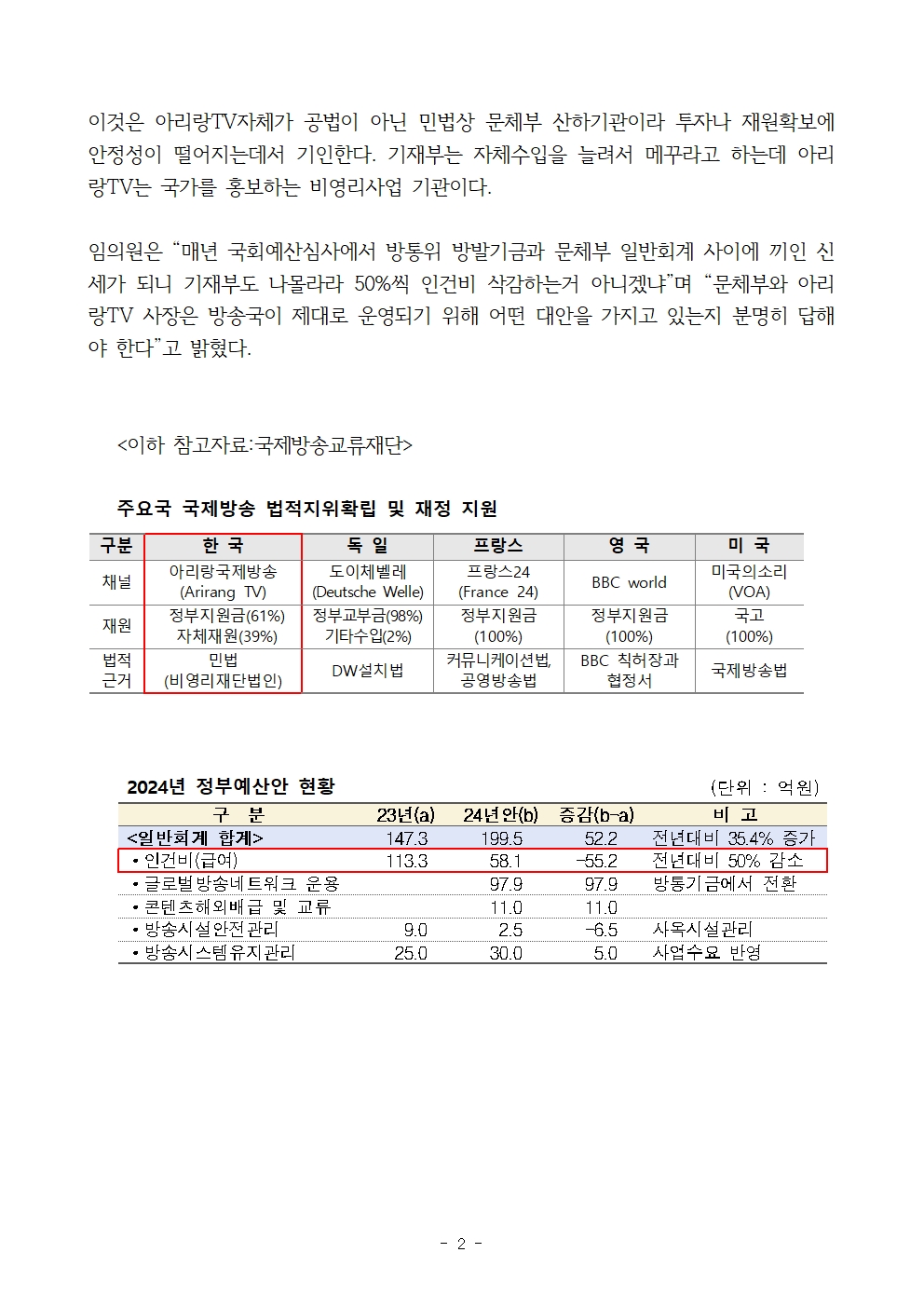 [임오경의원 국감보도자료]내년도 인건비 절반 삭감된 국제방송 아리랑TV, 존폐위기로 내몰리나
