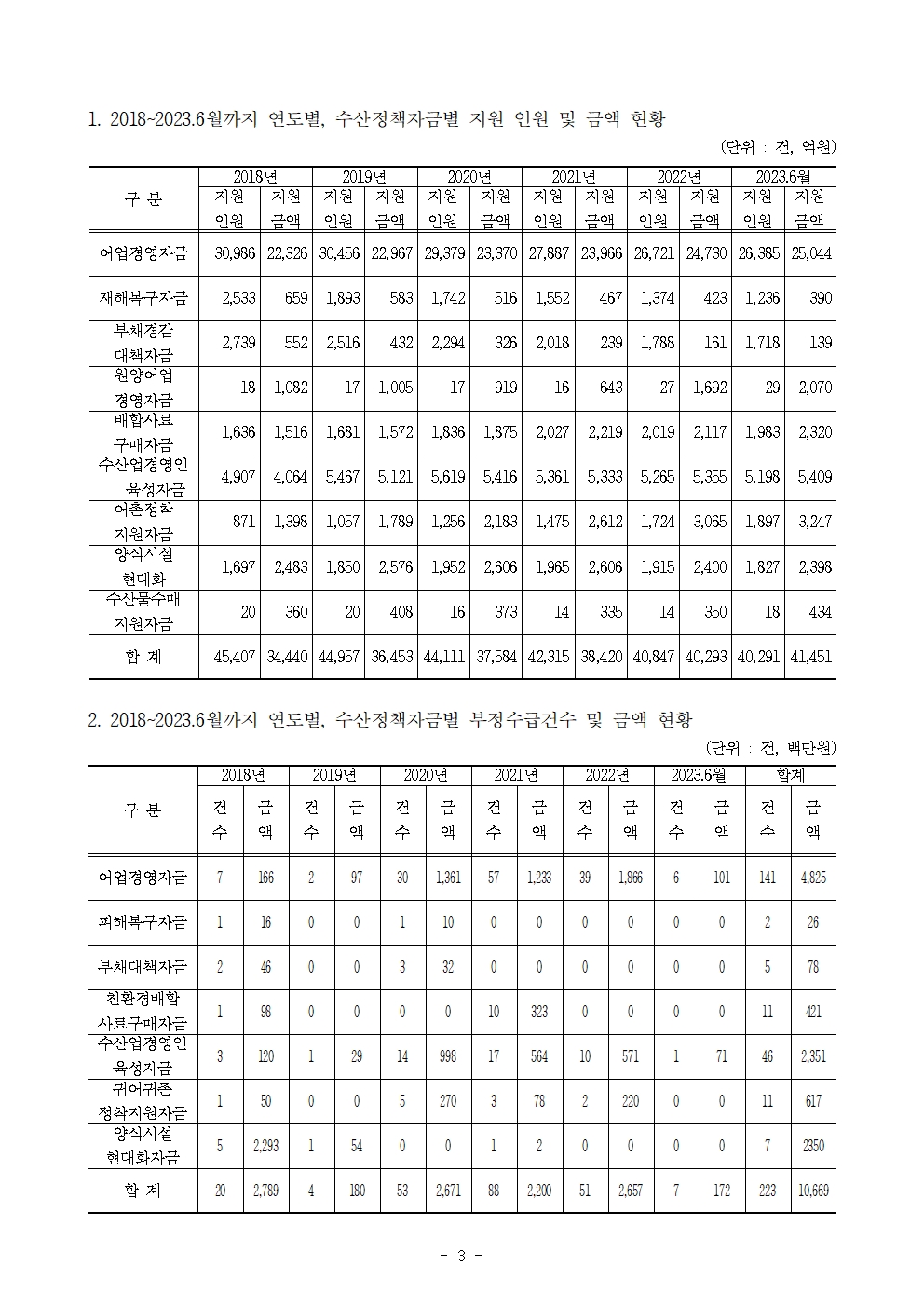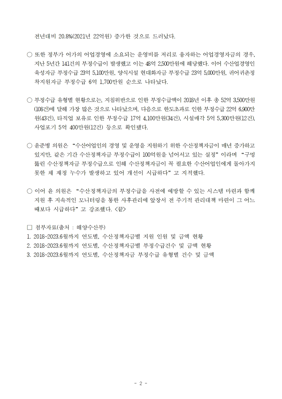 [윤준병 의원 국정감사 보도자료] 윤준병 의원, 수산정책자금 부정수급 5년간 223명·106억원 달해!