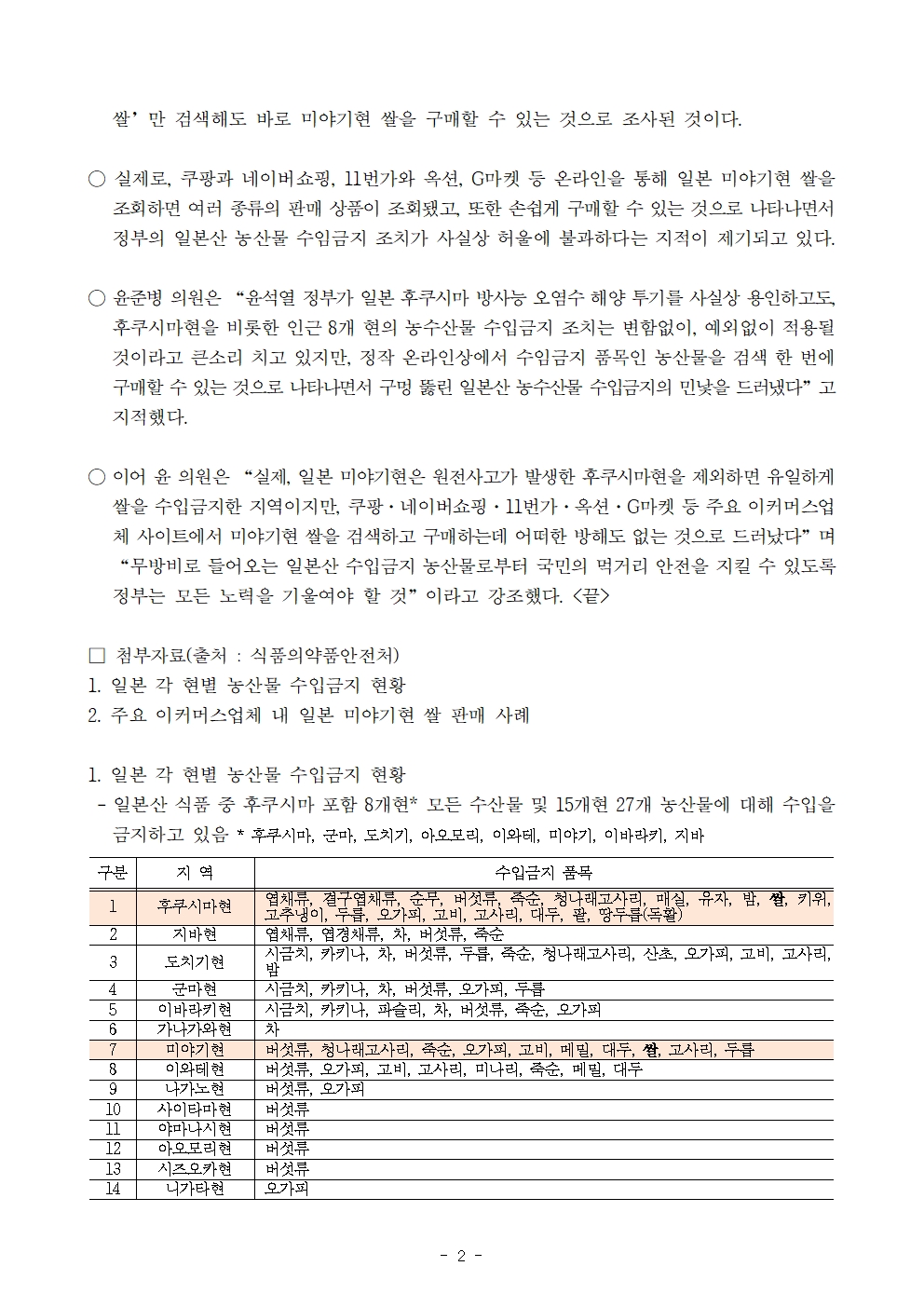 231006 [윤준병 의원 국정감사 보도자료] 윤준병 의원 수입금지 품목인 일본 미야기현 쌀 손쉽게 온라인 구매 가능.hwp