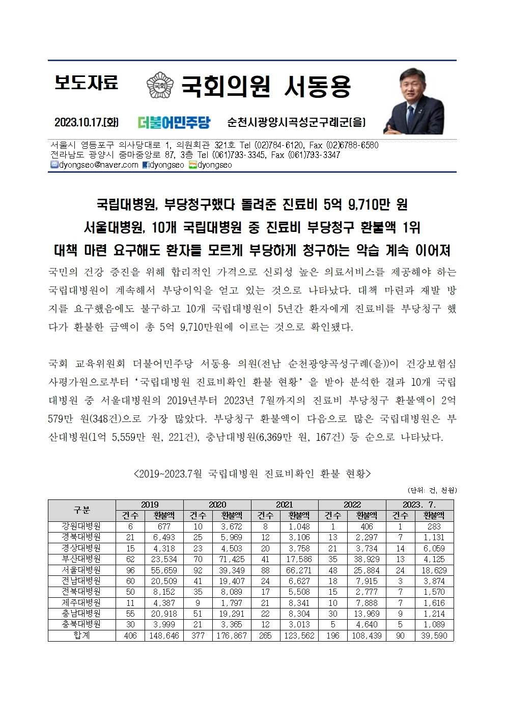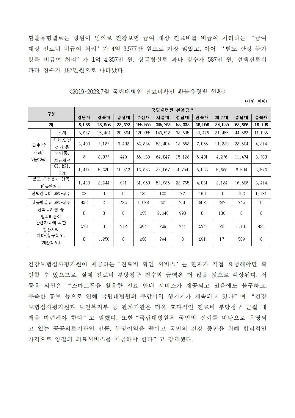 25. 231017_국감_서동용_국립대병원_진료비_부당청구했다_환불_5억_9710만원.hwp