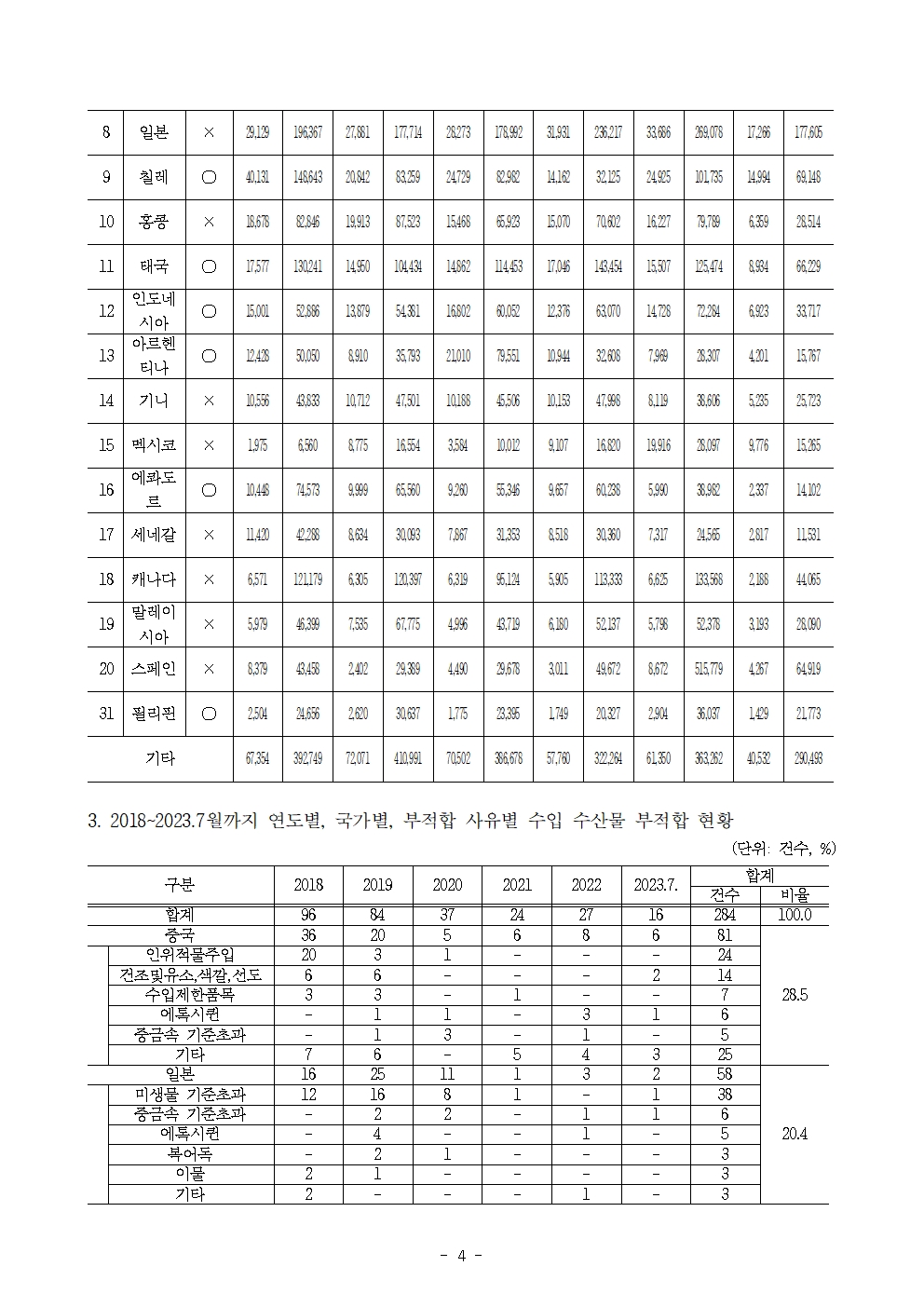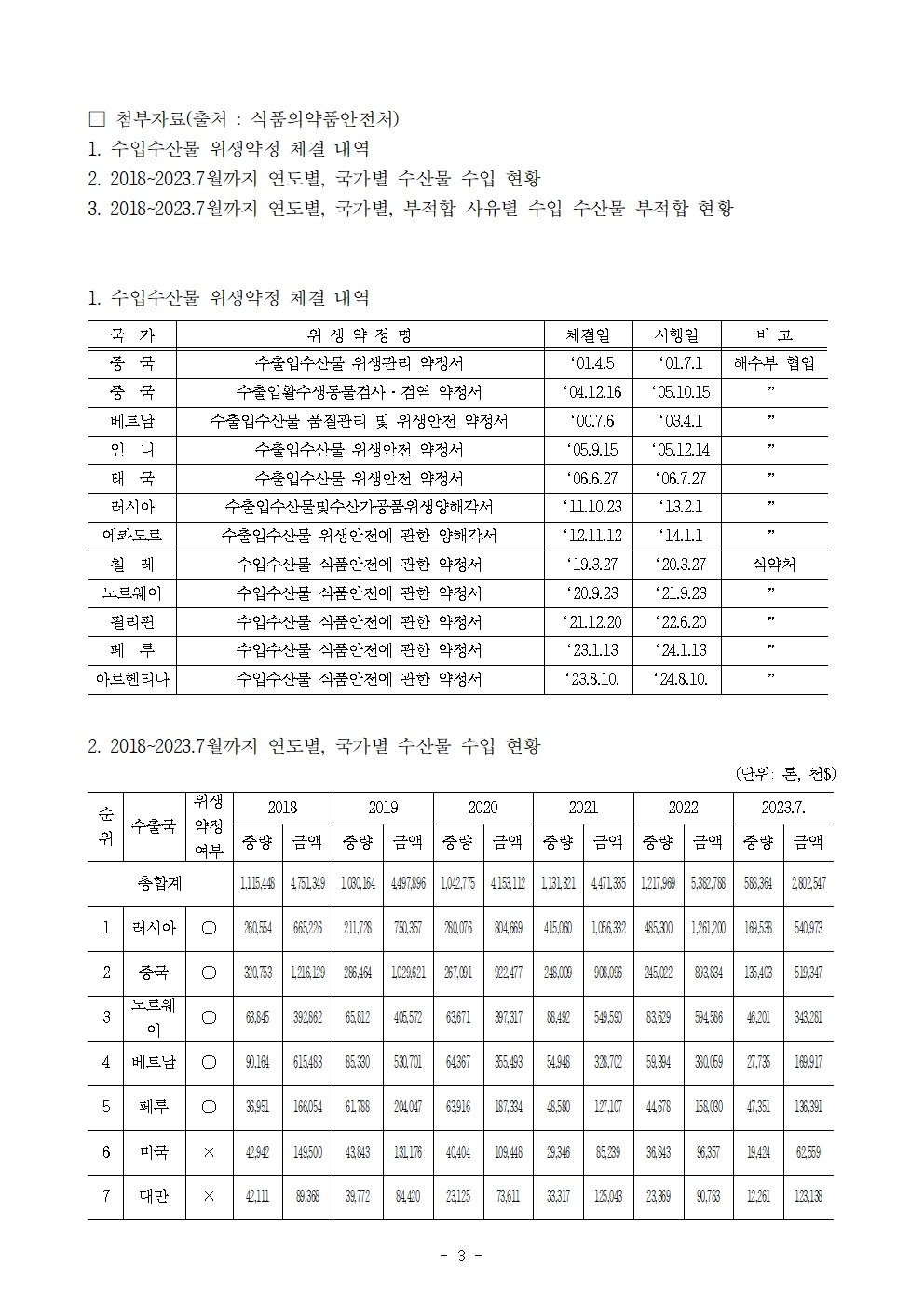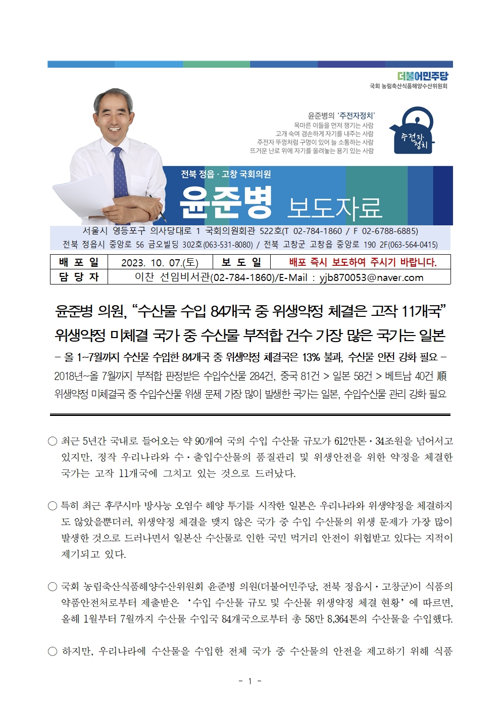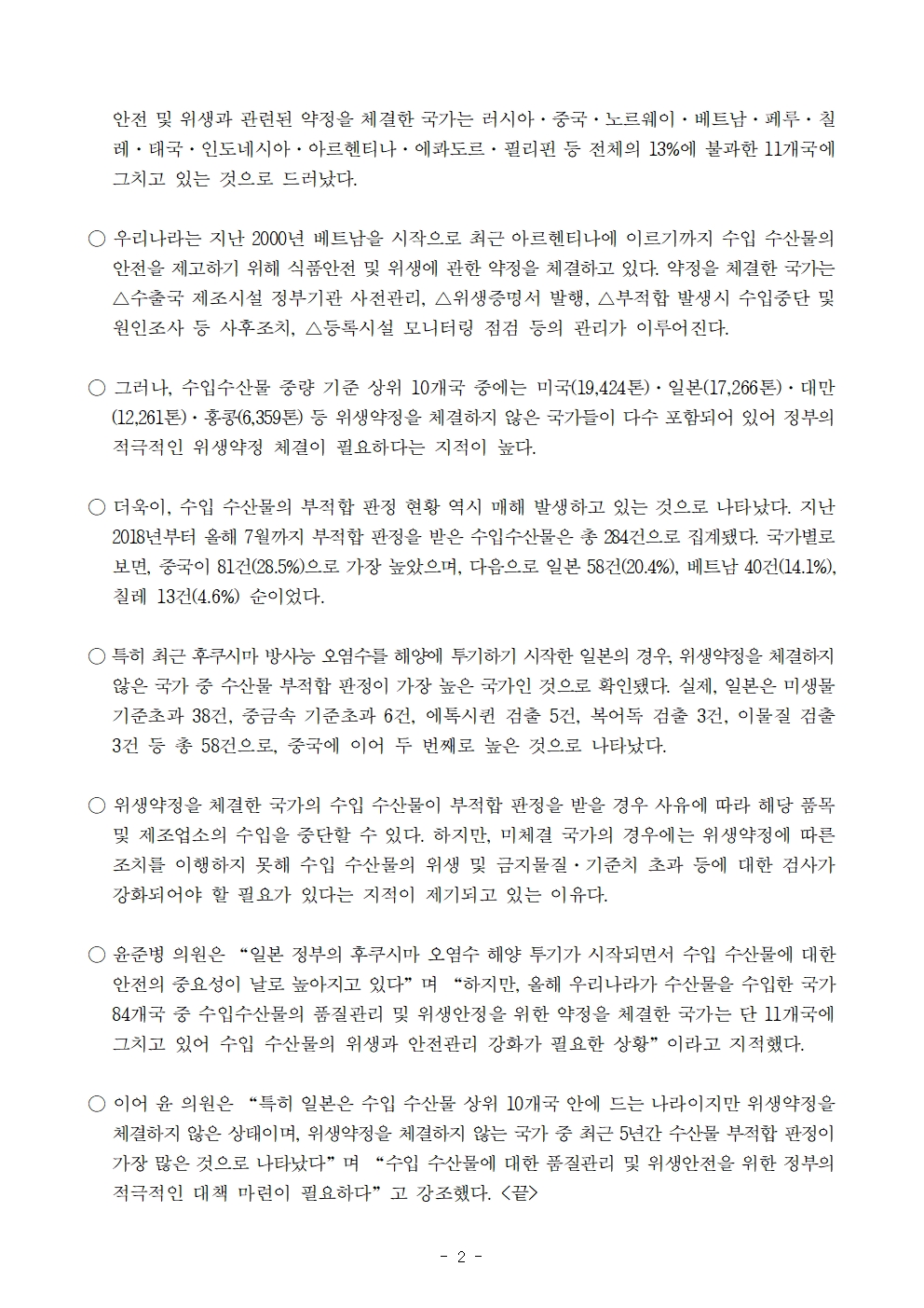 [윤준병 의원 국정감사 보도자료] 윤준병 의원, 위생약정 미체결 국가 중 수산물 부적합 건수 가장 많은 국가는 일본