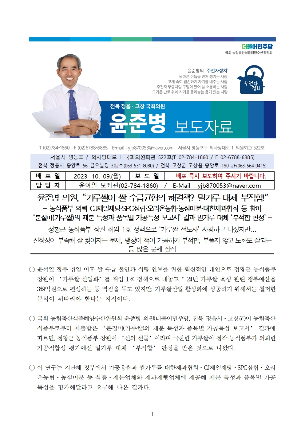 [윤준병 의원 국정감사 보도자료] 윤준병 의원, “가루쌀이 쌀 수급균형의 해결책 밀가루 대체 부적합!”