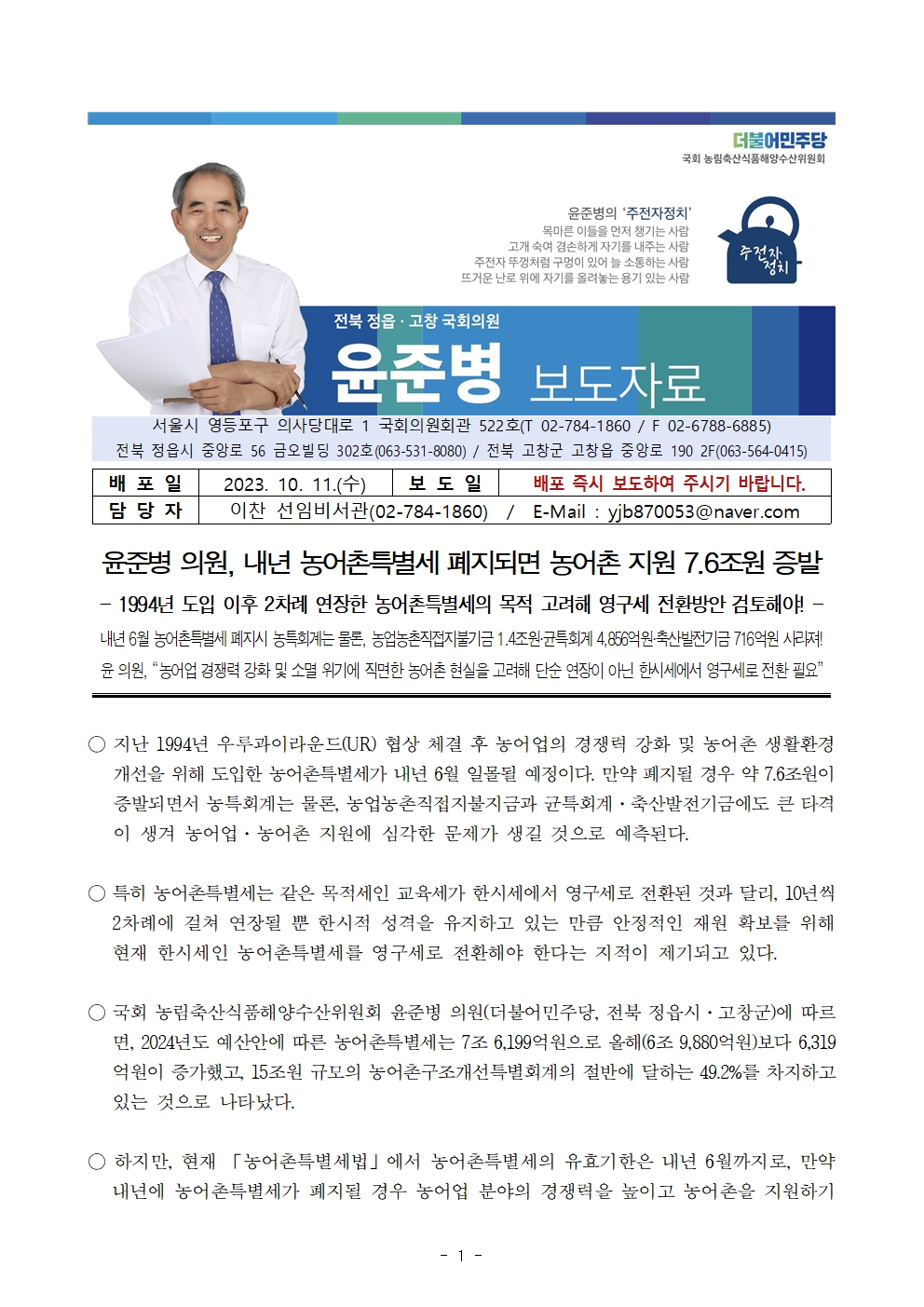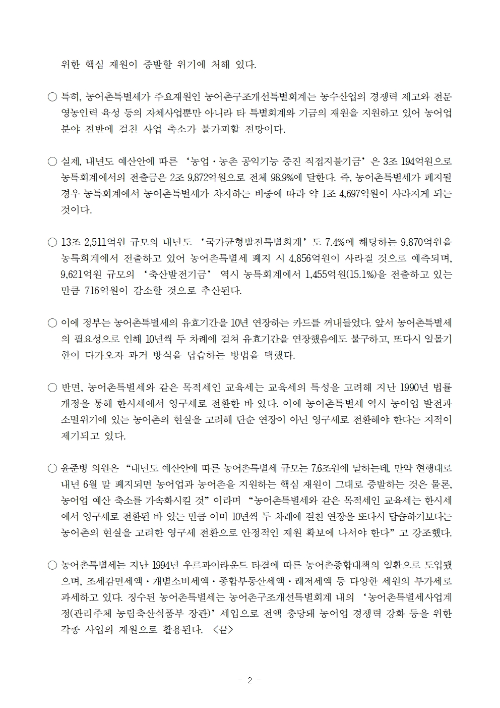 231011 [윤준병 의원 국정감사 보도자료] 윤준병 의원 내년 농어촌특별세 폐지되면 농어촌 지원 7.6조원 증발.hwp