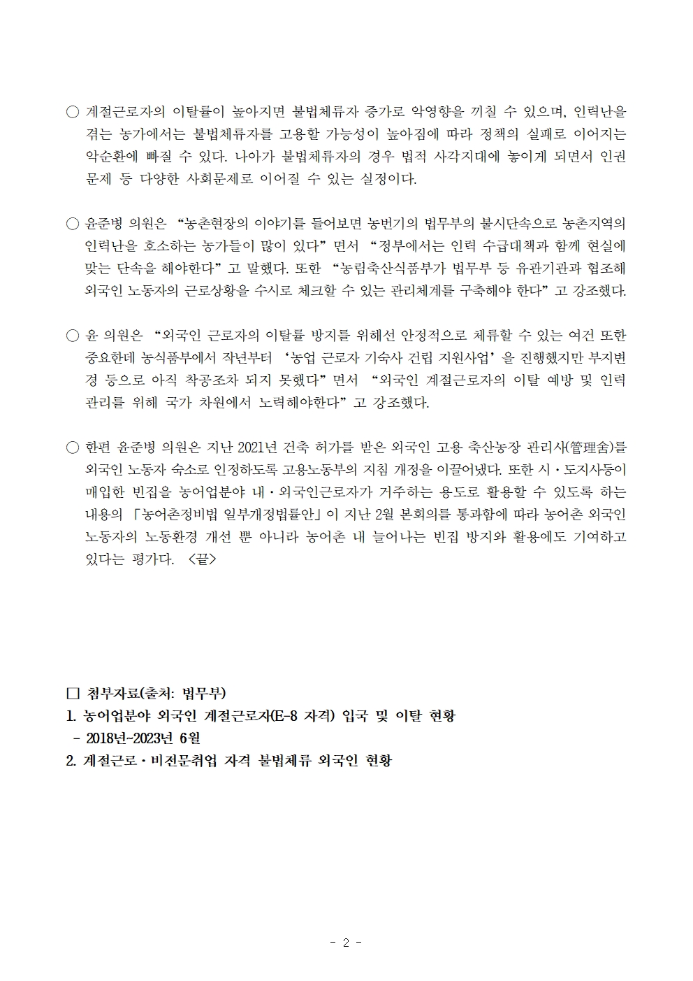 231011 [윤준병 의원 국정감사 보도자료] 윤준병 의원_ 농촌 현실에 맞는 외국인노동자 이탈 예방 및 인력관리 요구.hwp