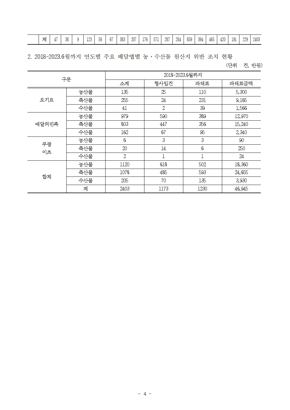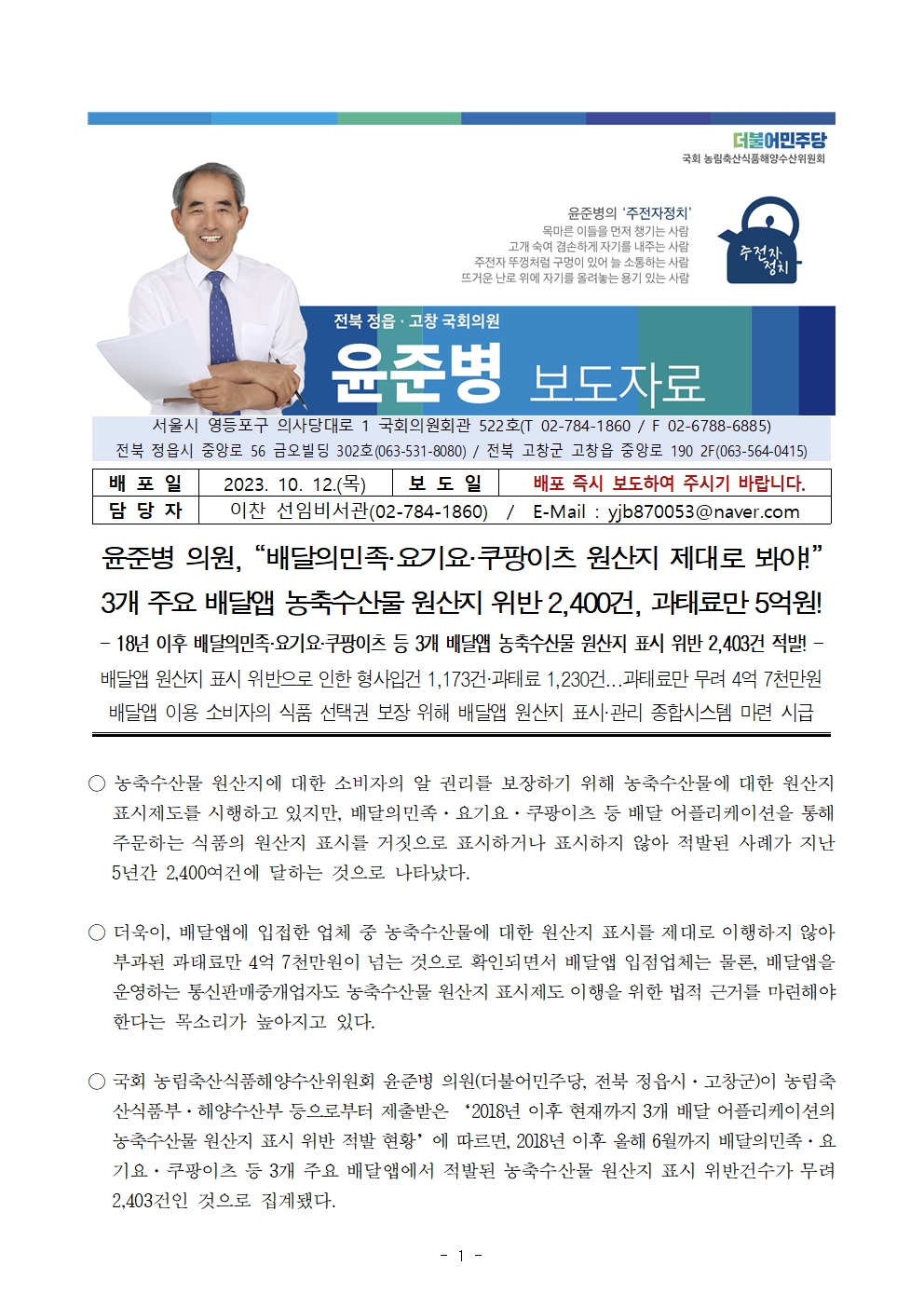 231012 [윤준병 의원 국정감사 보도자료] 윤준병 의원 3개 주요 배달앱 농축수산물 원산지 위반 2400건 과태료만 5억원!.hwp
