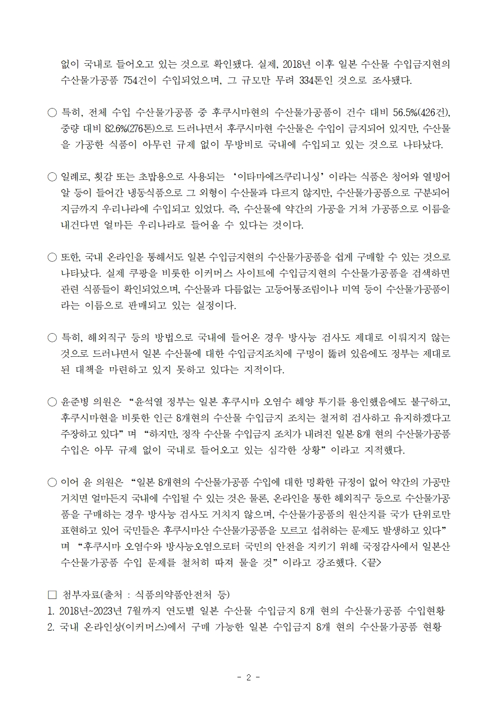 231012 [윤준병 의원 국정감사 보도자료] 윤준병 의원 수산물 수입금지 8개현의 수산물 가공품 수입 5년간 754건·276톤.hwp